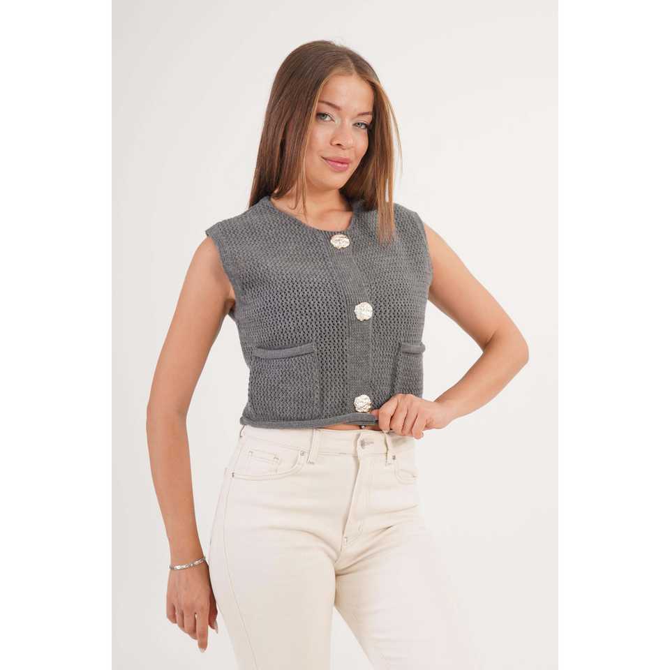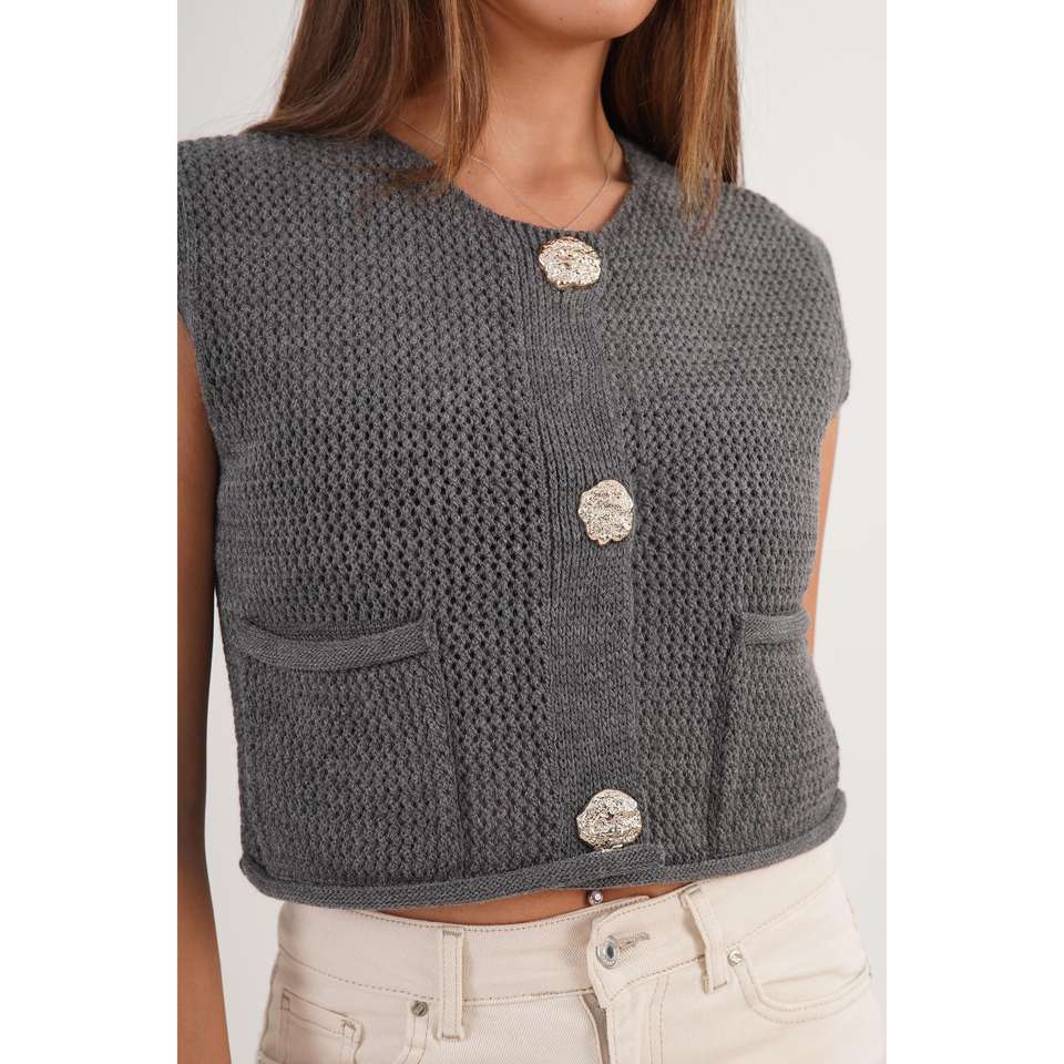 เสื้อกั๊กถักไหมพรมสีแอนทราไซต์สำหรับผู้หญิง ผ้าขนสัตว์ ไม่มีแขนเสื้อ กระดุมสีทอง มีกระเป๋าคู่ สวมใส่เป็นเสื้อนอก