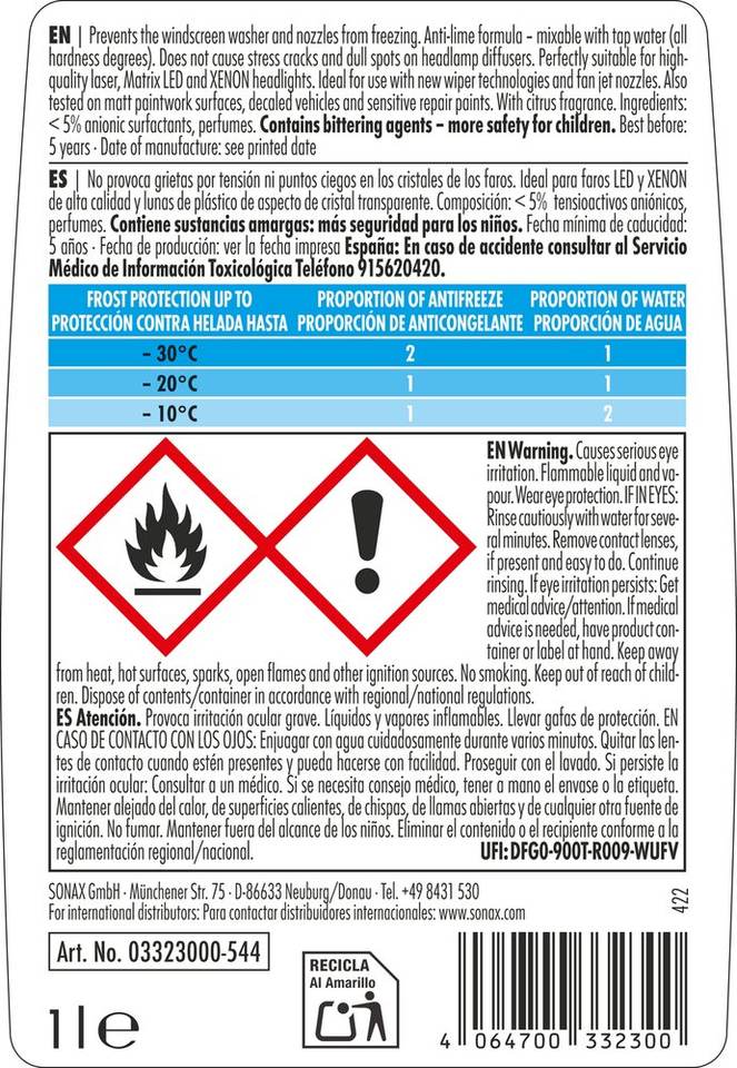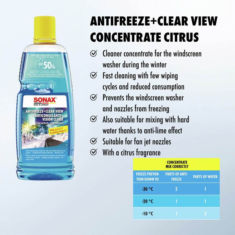 น้ำยาป้องกันน้ำแข็งเกาะและทำความสะอาดกระจกสูตรเข้มข้น กลิ่นส้ม ขนาด 1 ลิตร สำหรับกระจกรถยนต์ในภูมิอากาศที่อบอุ่น