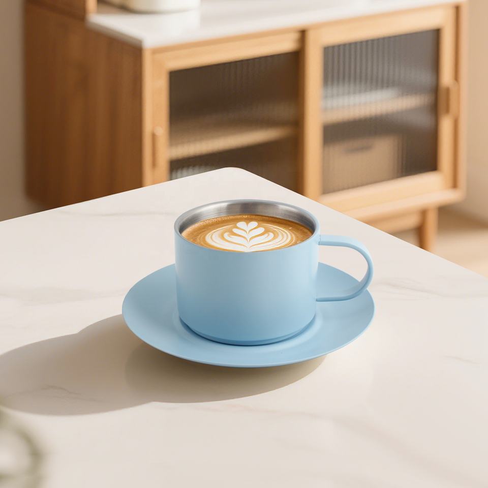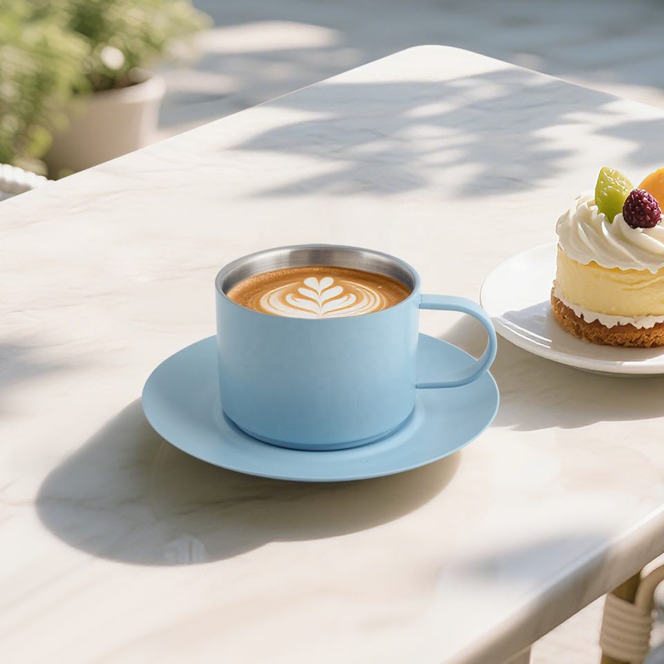 ชุดถ้วยเอสเพรสโซ่และจานรองป้องกันสนิมทำจากสแตนเลสผนังสองชั้น
