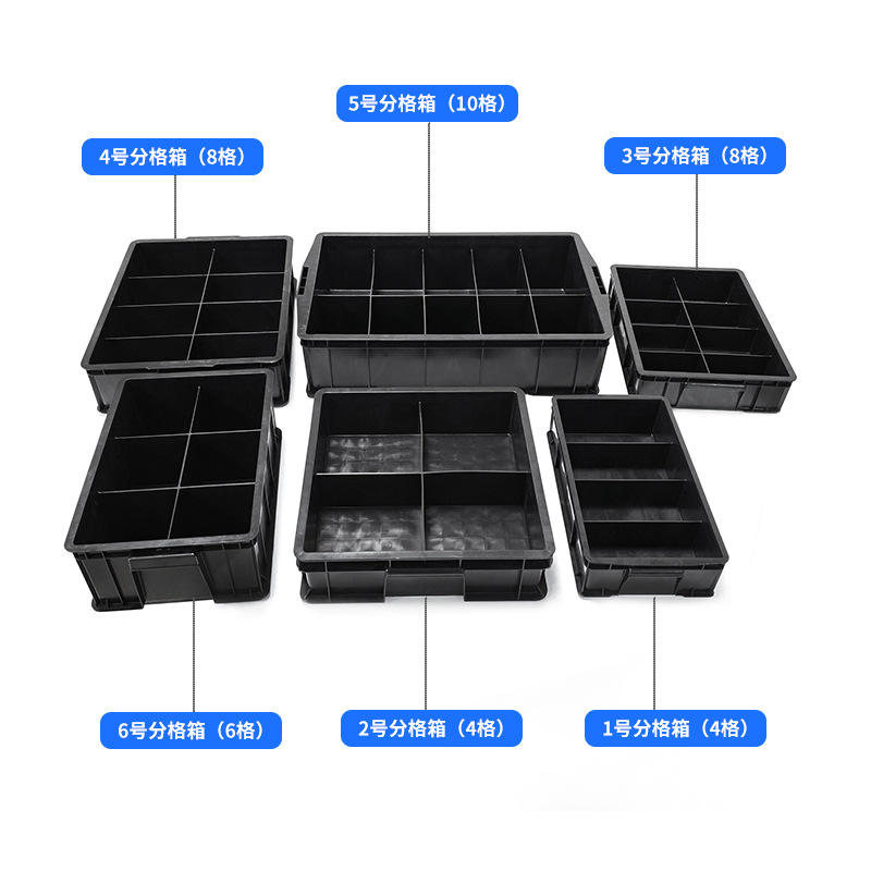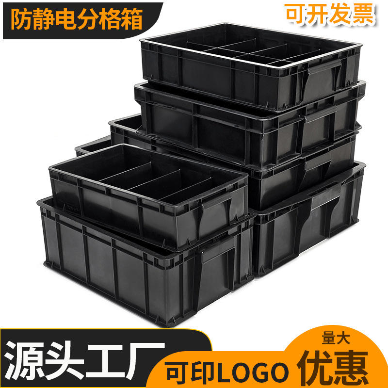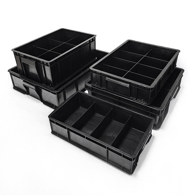 กล่องเก็บของพลาสติกป้องกันไฟฟ้าสถิต สีดำ รูปทรงสี่เหลี่ยมผืนผ้า สามารถวางซ้อนกันได้ สำหรับชิ้นส่วนอิเล็กทรอนิกส์ วัสดุ PEHDPEPP ผลิตด้วยวิธีฉีดขึ้นรูปครั้งเดียว