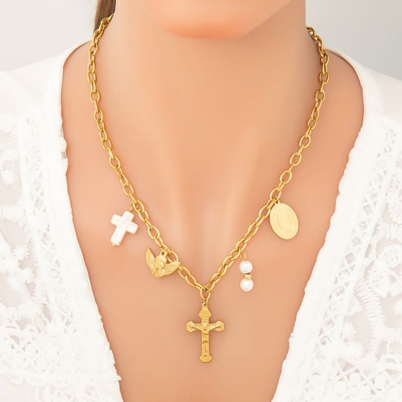 สร้อยคอจี้รูปกางเขนทองคำแท้ 18K ป้องกันการหมอง พร้อมไข่มุกและสแตนเลส สำหรับผู้หญิงและเด็กผู้หญิง ของใช้ทางศาสนาคริสต์นิกายคาทอลิก
