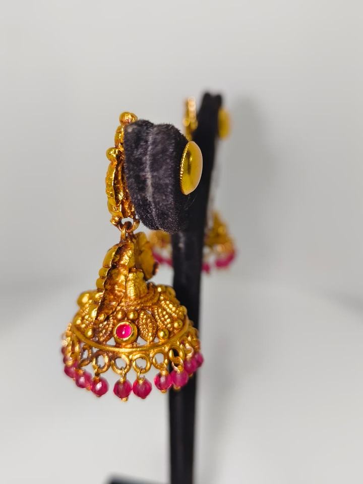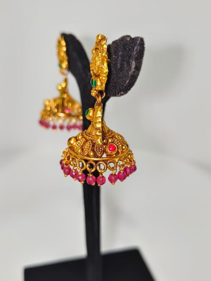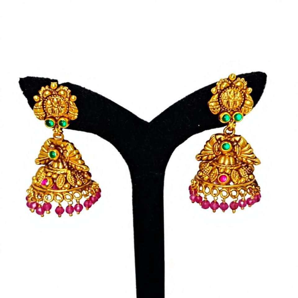 ต่างหูทองคำแท้ 22k แบบโบราณ ประดับมรกตสีเขียวและไข่มุกธรรมชาติ ลายพระลักษมี ทำด้วยมือ เหมาะสำหรับงานแต่งงาน