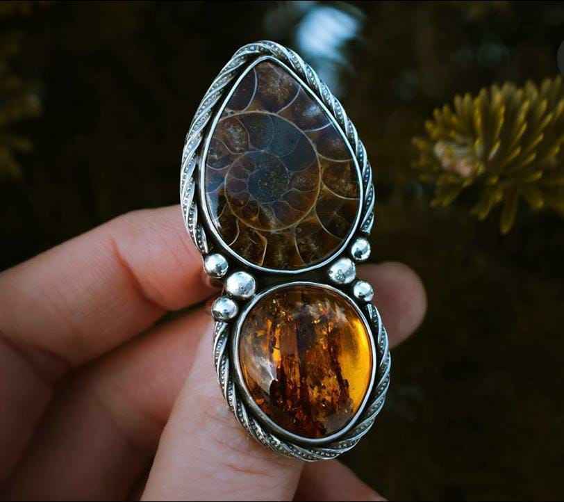 ชื่อผลิตภัณฑ์:Ammonite & Amber ที่ยอดเยี่ยม925เงินสเตอร์ลิงแหวนเครื่องประดับ