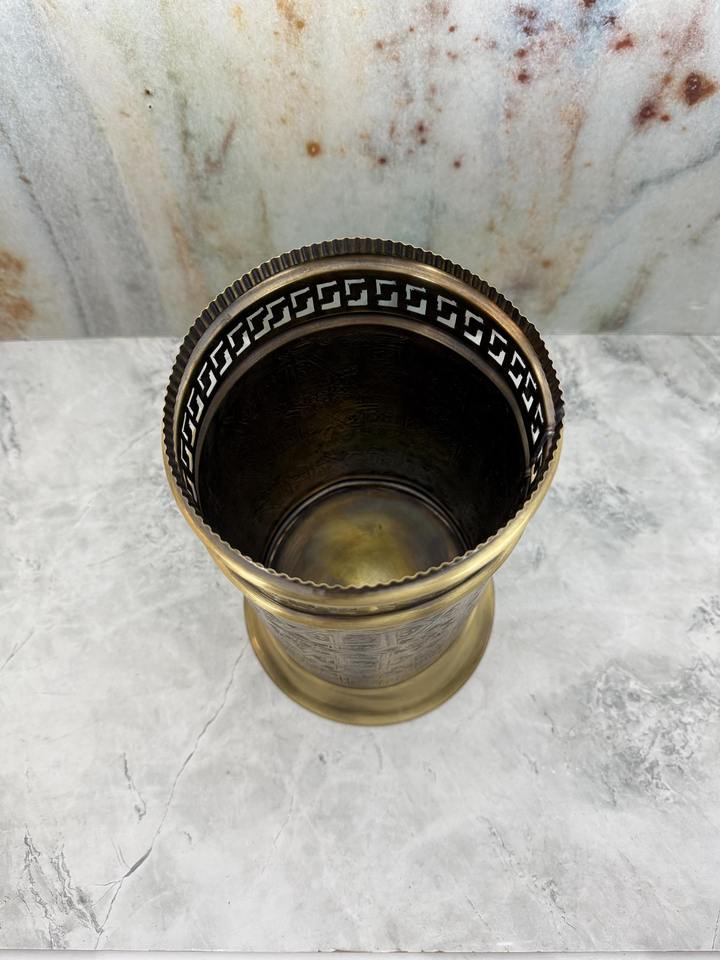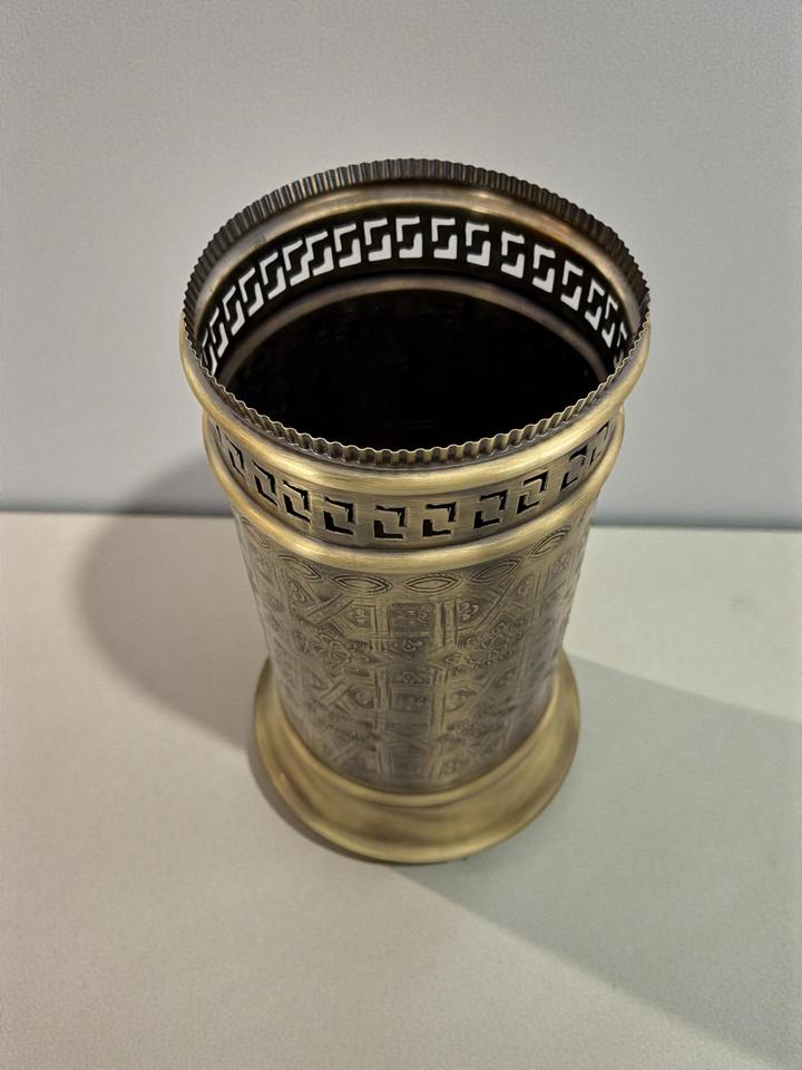 ถังขยะทองเหลืองโบราณสลักลายกรีกคีย์ เหมาะสำหรับตกแต่งบ้านหรูหราและตกแต่งภายในสไตล์คลาสสิกจากอินเดีย