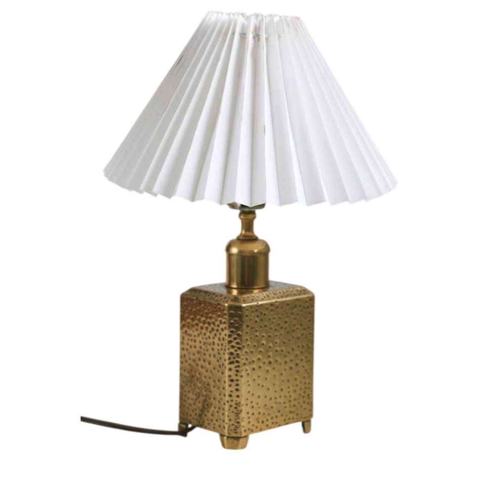 โคมไฟตั้งโต๊ะโลหะทองเหลืองโบราณแบบตอกลาย ผิวสัมผัสสีบรอนซ์ขัดน้ำมัน พร้อมโป๊ะผ้าลินินทรงกลม สำหรับตกแต่งห้องนั่งเล่น ห้องนอนครอบครัว หรือสำนักงาน