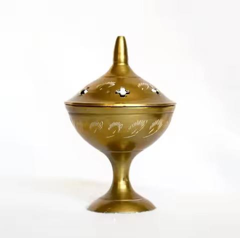 เตาเผากำยานทองเหลืองโบราณพร้อมด้ามจับไม้ ฝาปิดลายฉลุดอกไม้ ที่ใส่ถ่านตกแต่งสำหรับบ้านและการทำสมาธิ