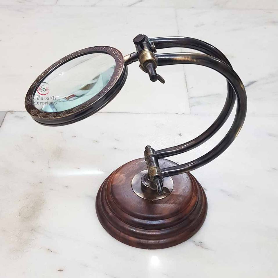 แว่นขยายทองเหลืองโบราณพร้อมฐานไม้แว่นขยายทางทะเลสไตล์วินเทจ