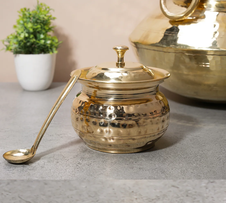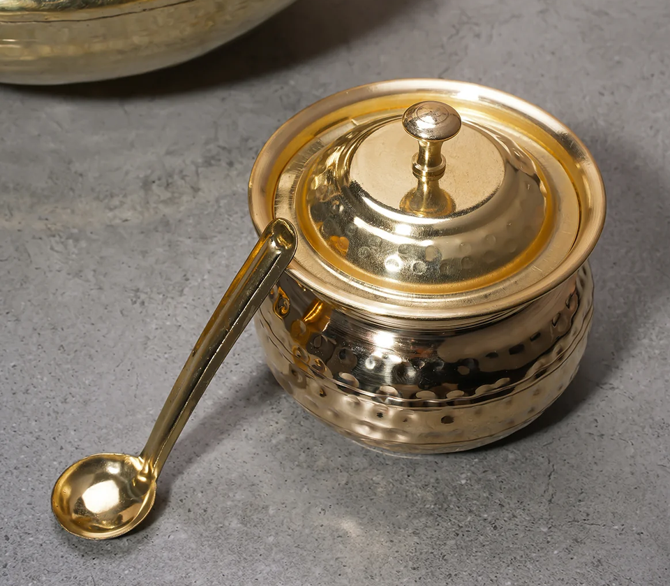 ชุดภาชนะโลหะทองเหลืองโบราณดีไซน์คลาสสิกเป็นมิตรต่อสิ่งแวดล้อมช้อนเนยใสมาซาลาดานิกล่องเครื่องเทศโรตีโดซาทาทาทาวา
