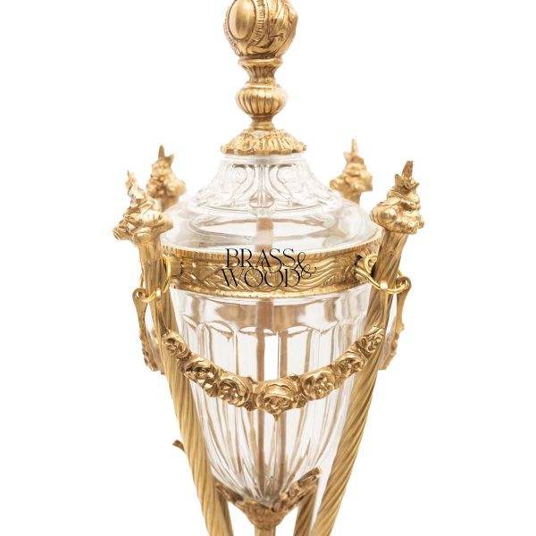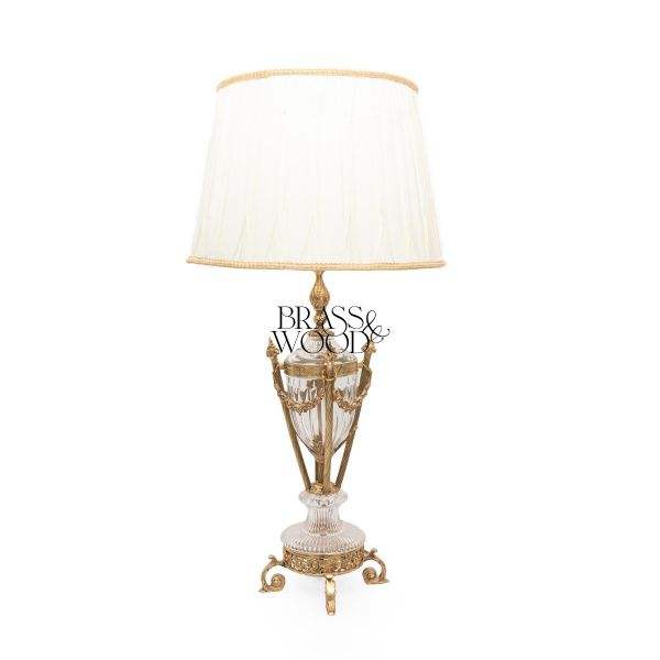 ฐานโคมไฟตั้งโต๊ะทองเหลืองและคริสตัลโบราณมีรายละเอียดหรูหราและตกแต่งด้วยแท่นแกะสลักสำหรับการตกแต่งภายในที่หรูหราแบบคลาสสิก