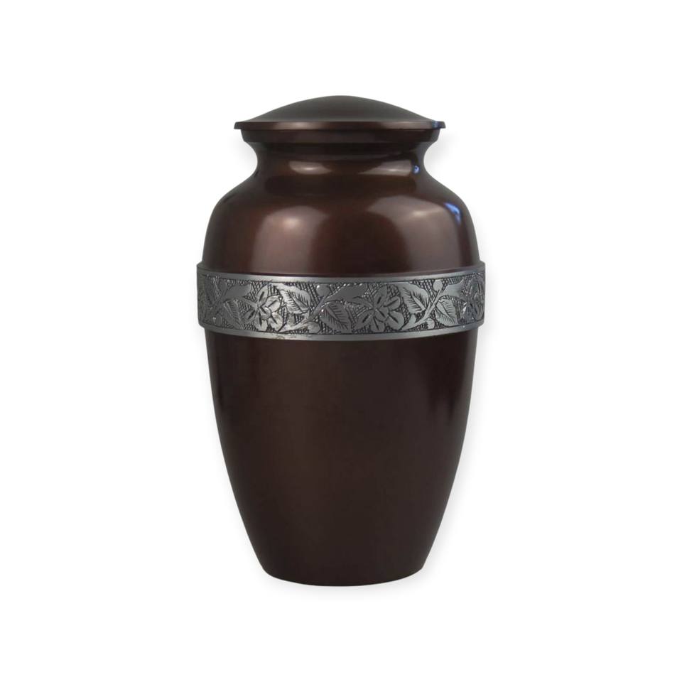 โกศบรรจุอัฐิโลหะสีน้ำตาลโบราณ พร้อมแถบใบไม้สีเงิน สำหรับบรรจุอัฐิผู้ใหญ่ตามแบบดั้งเดิม