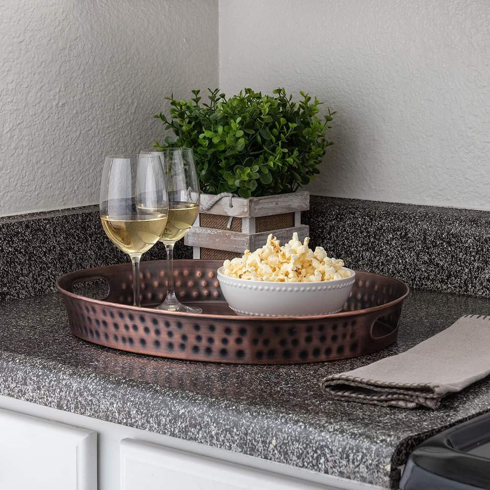ถาดเสิร์ฟโลหะขัดเงาแบบตอกลาย คุณภาพระดับพาณิชย์ รูปทรงวงรี ดีไซน์หรูหรา สำหรับออตโตมัน ห้องครัว ห้องน้ำ เคาน์เตอร์ จัดระเบียบบ้าน