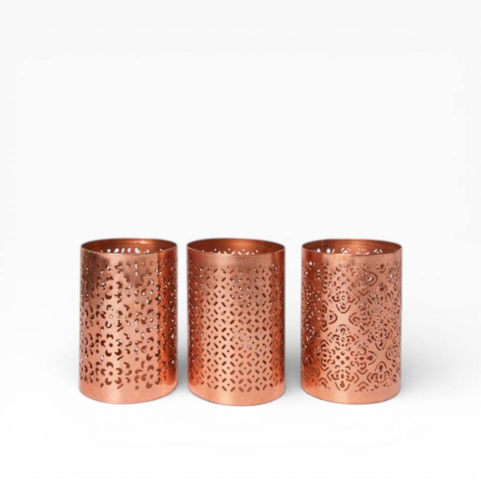 ชุดเชิงเทียนโลหะทองแดงโบราณที่มีรูปแบบจุดแบบเจาะรูสำหรับให้แสงสว่างโดยรอบ