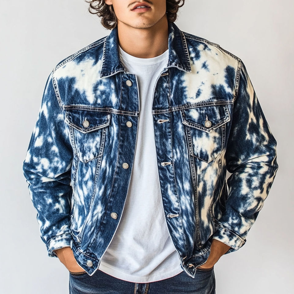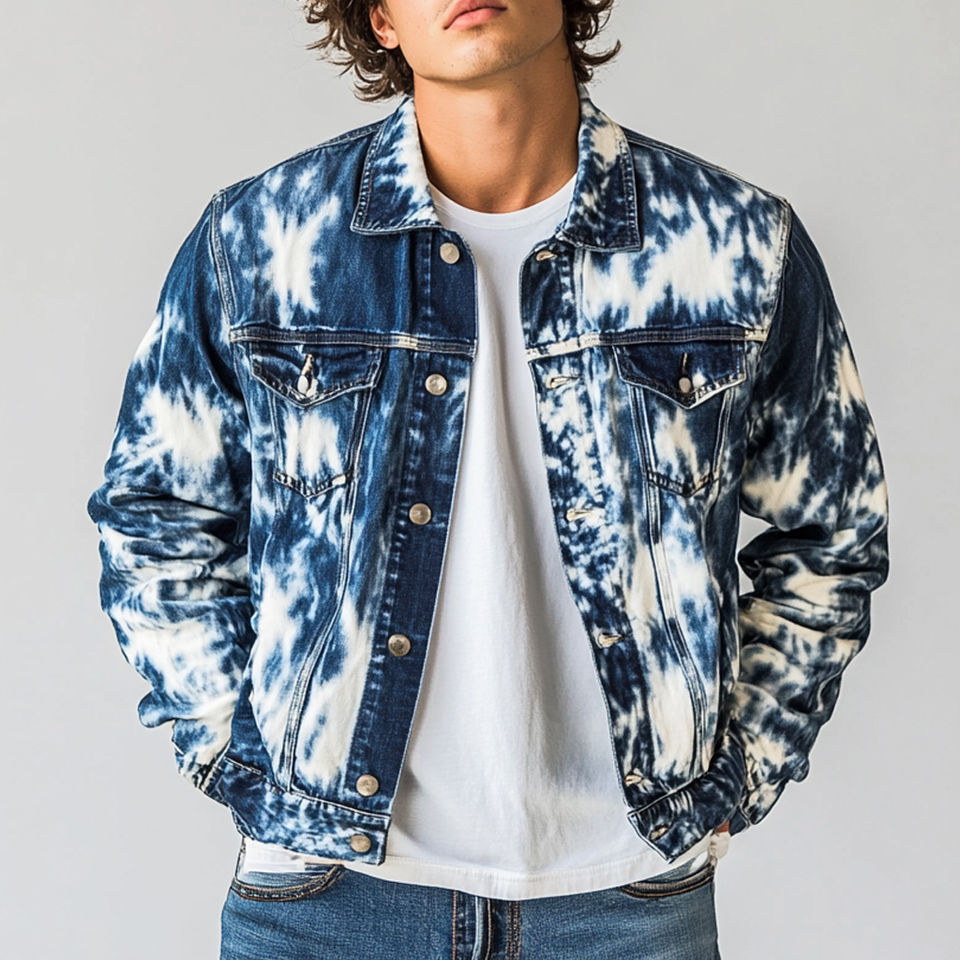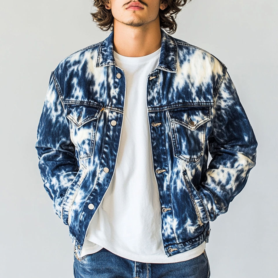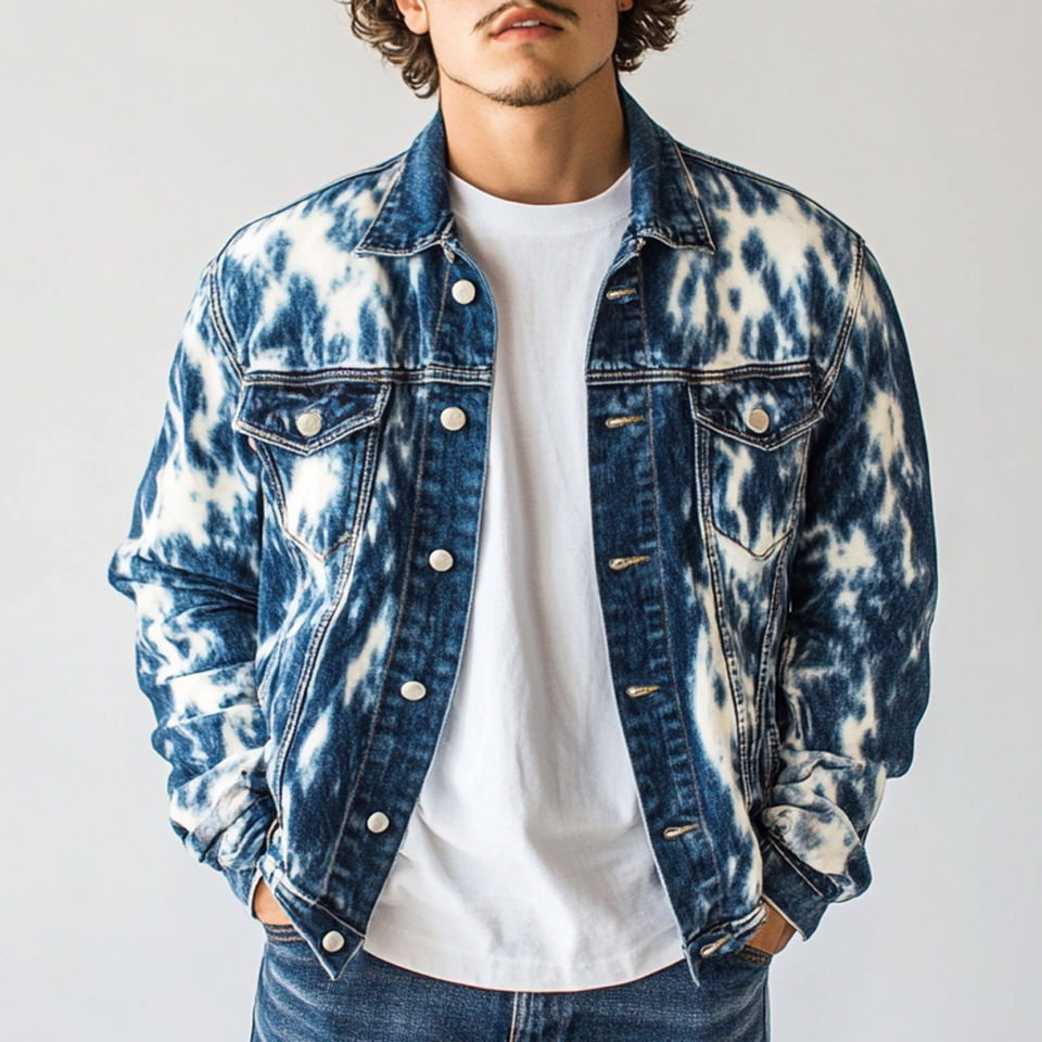 เสื้อแจ็คเก็ตยีนส์ผู้ชายพิมพ์ลายโลโก้แบบโบราณ สไตล์สตรีทแวร์ สำหรับกิจกรรมกลางแจ้ง ไซส์ใหญ่ ติดกระดุม ลายมัดย้อม