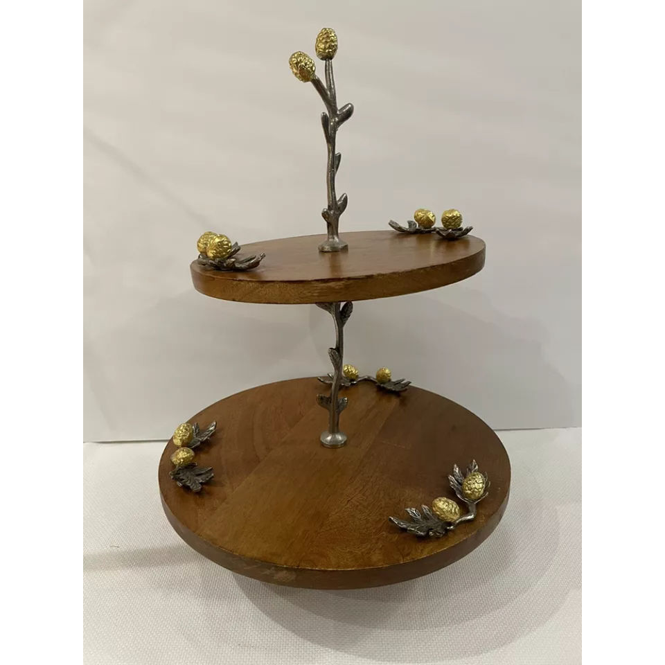Antique Design 2 Tier Cake Stand Made of Wood Cake Stand With Gold Metal Handle for Tabletop Cake Serving Stand in Low Price