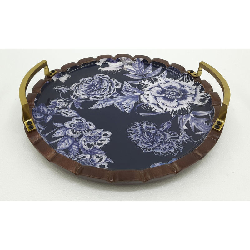 ถาดเสิร์ฟอาหารไม้ทรงกลมพร้อมด้ามโลหะสำหรับตกแต่งบ้านและโรงแรมถาดเสิร์ฟอาหารดีไซน์โบราณ