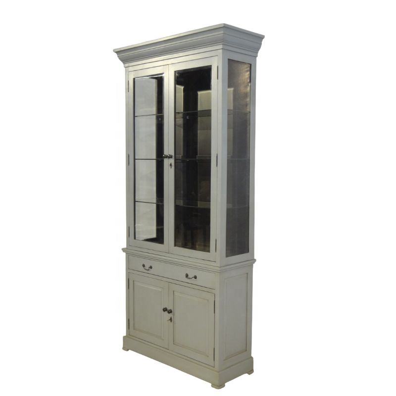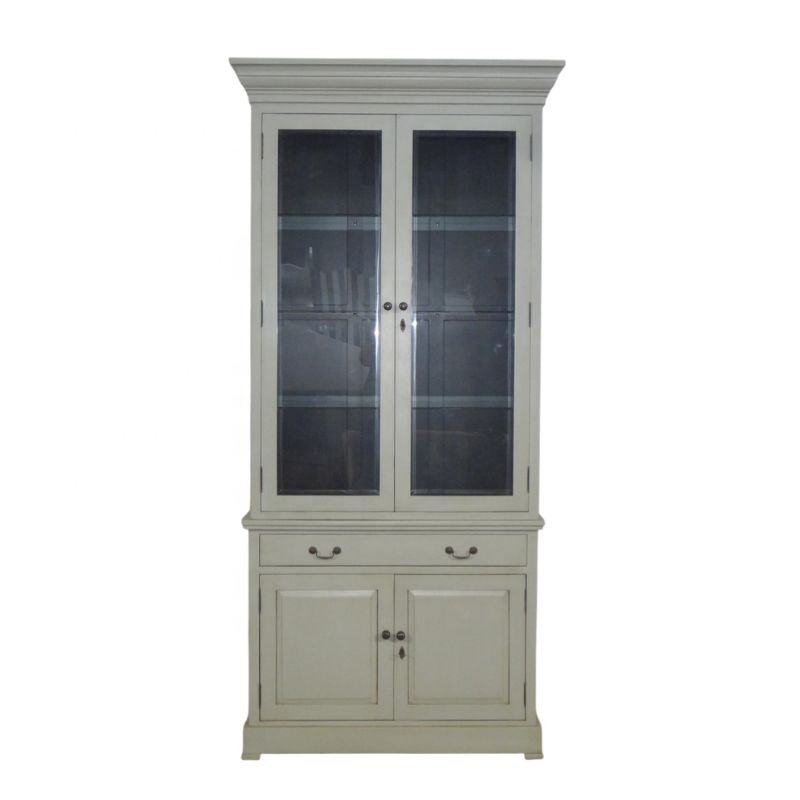 ตู้โชว์หนังสือแบบโบราณ ผ่านกระบวนการตกแต่งแบบดิสเทรส พร้อมบานประตู ใช้เป็นตู้บุฟเฟ่ต์ได้ ผลิตที่เมืองเจปารา จาวาตะวันกลาง อินโดนีเซีย