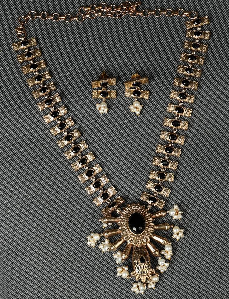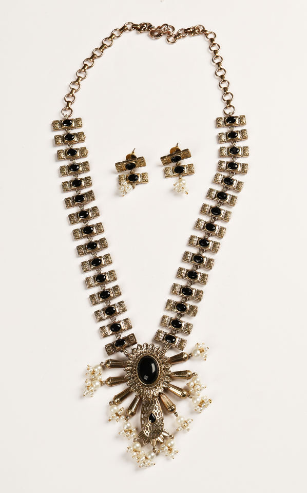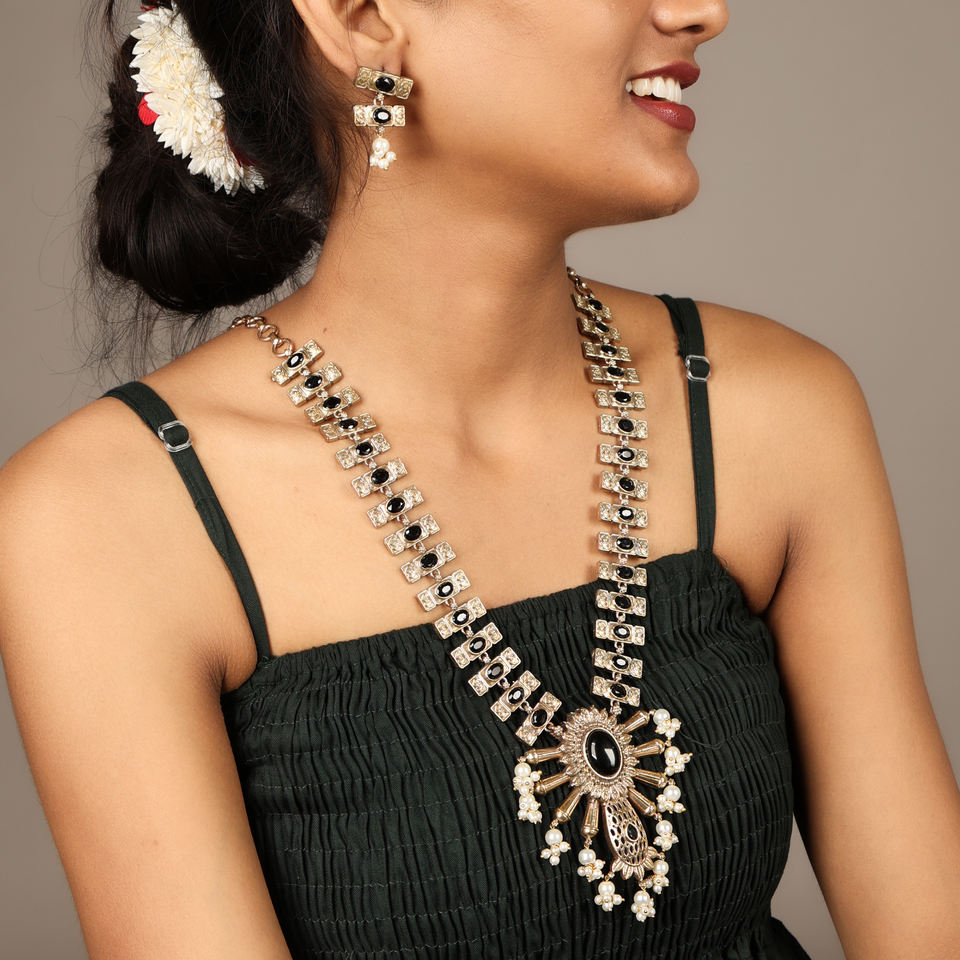 ชุดสร้อยคอแบบโบราณเคลือบออกซิไดซ์ ประดับด้วยหินสีดำและต่างหูมุกแบบห้อย