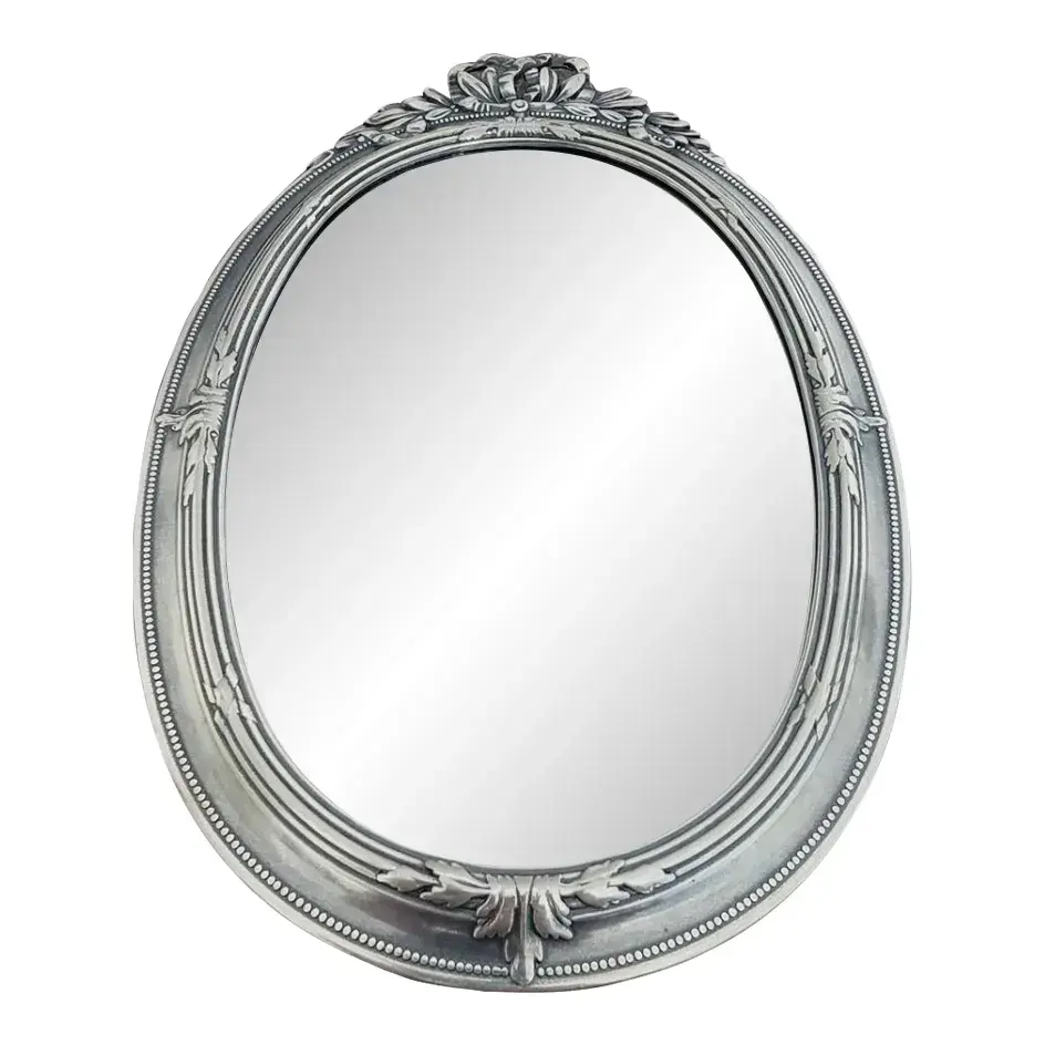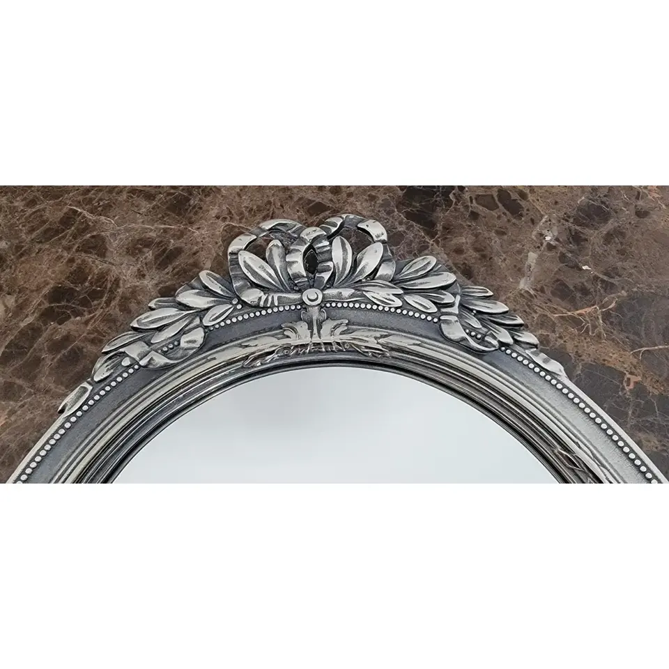 กระจกติดผนังรูปวงรีสีเงินสไตล์ฝรั่งเศสโบราณพร้อมการตกแต่งดอกไม้กระจกที่มองเห็นได้มีกรอบสีเงินหรูหรา