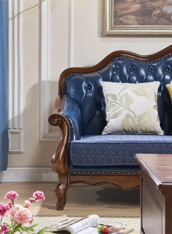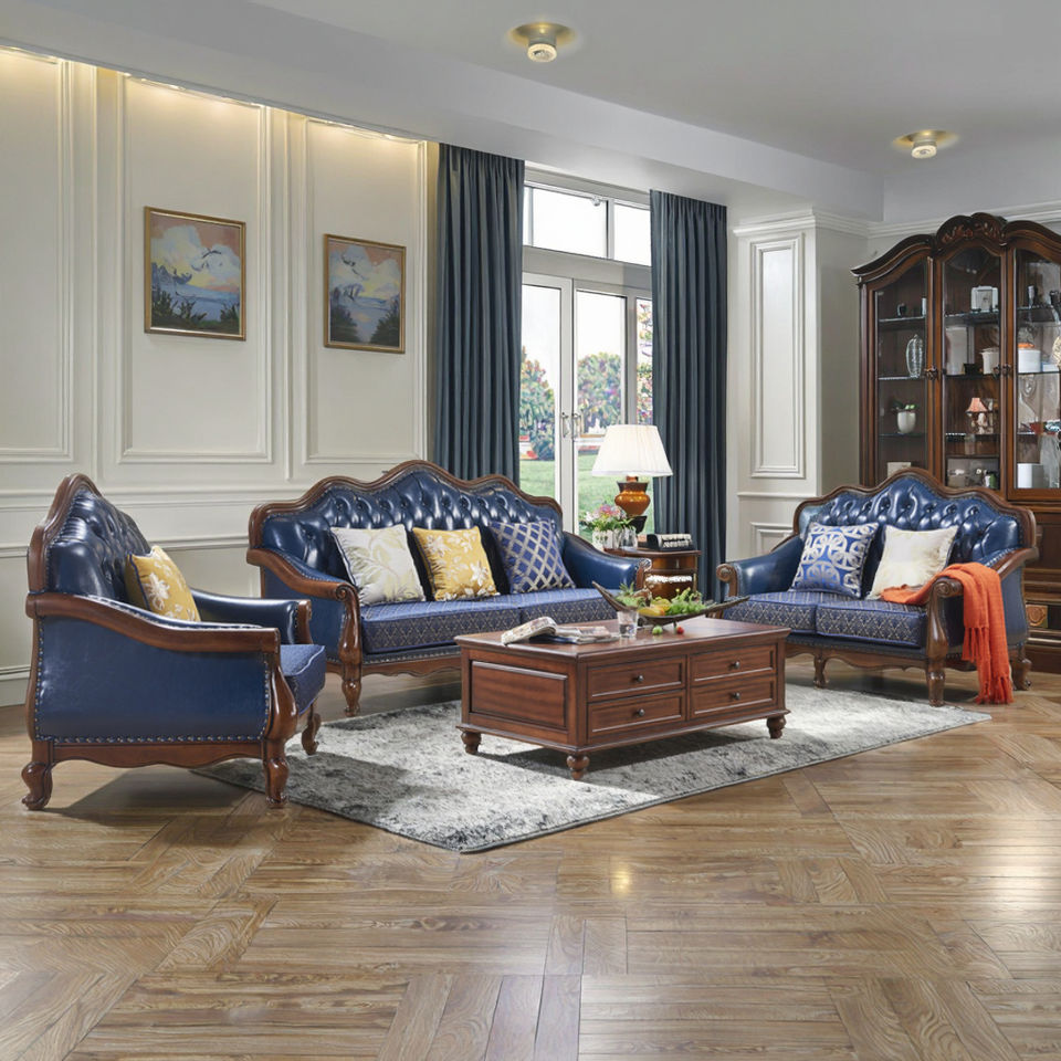 Antique Furniture Blue Classic Sofa Set Luxury Genuine Leather European Design Apartment Living Room