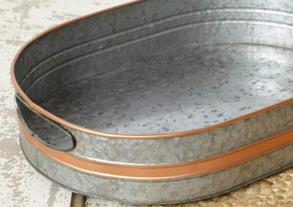 ถาดสังกะสีชุบสังกะสีโบราณพร้อมที่จับที่ถูกตัดออกและแถบทองแดงดีไซน์หรูหราสำหรับตกแต่งบ้าน