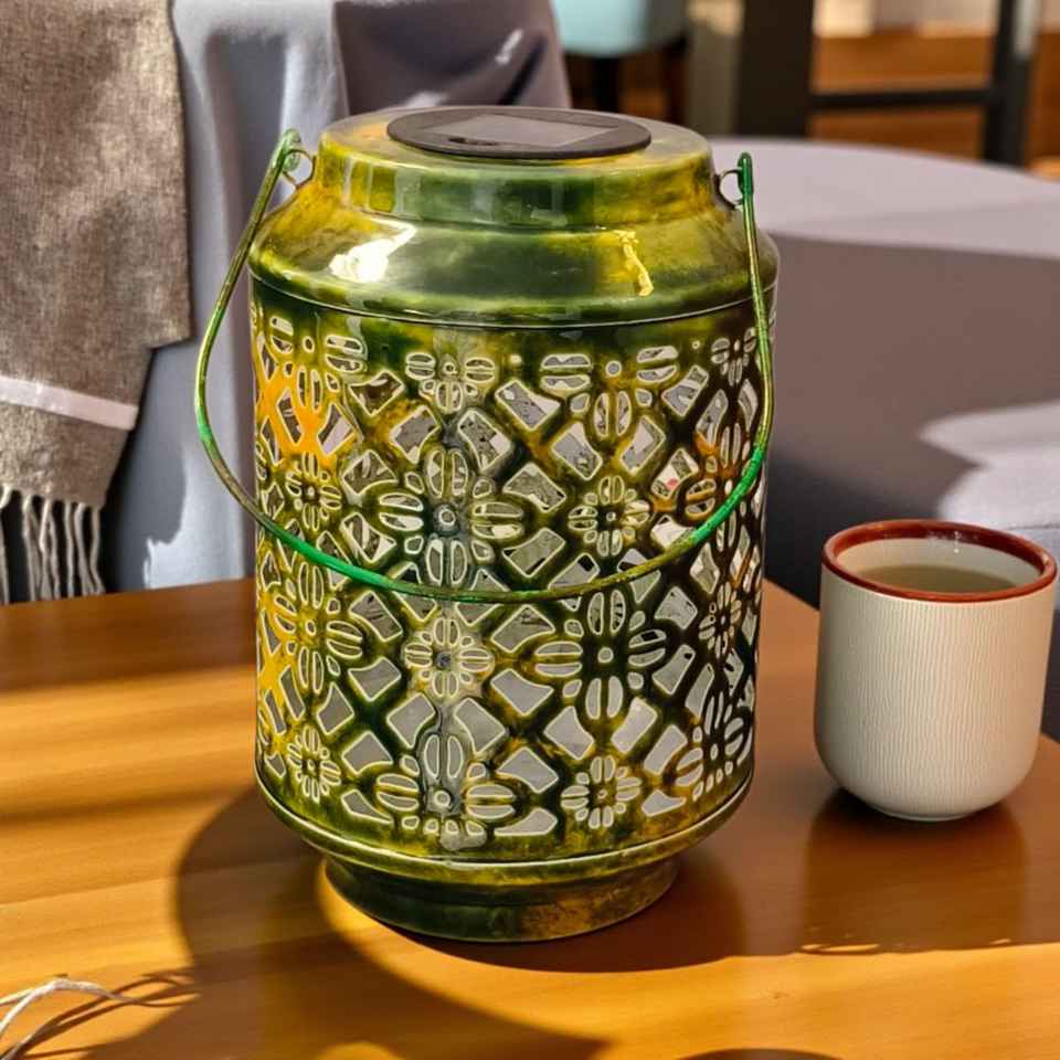 โคมไฟพลังงานแสงอาทิตย์โลหะสีเขียวโบราณพร้อมงานตัดดอกไม้ | ไฟตกแต่งสวนกลางแจ้งงานแฮนด์เมด