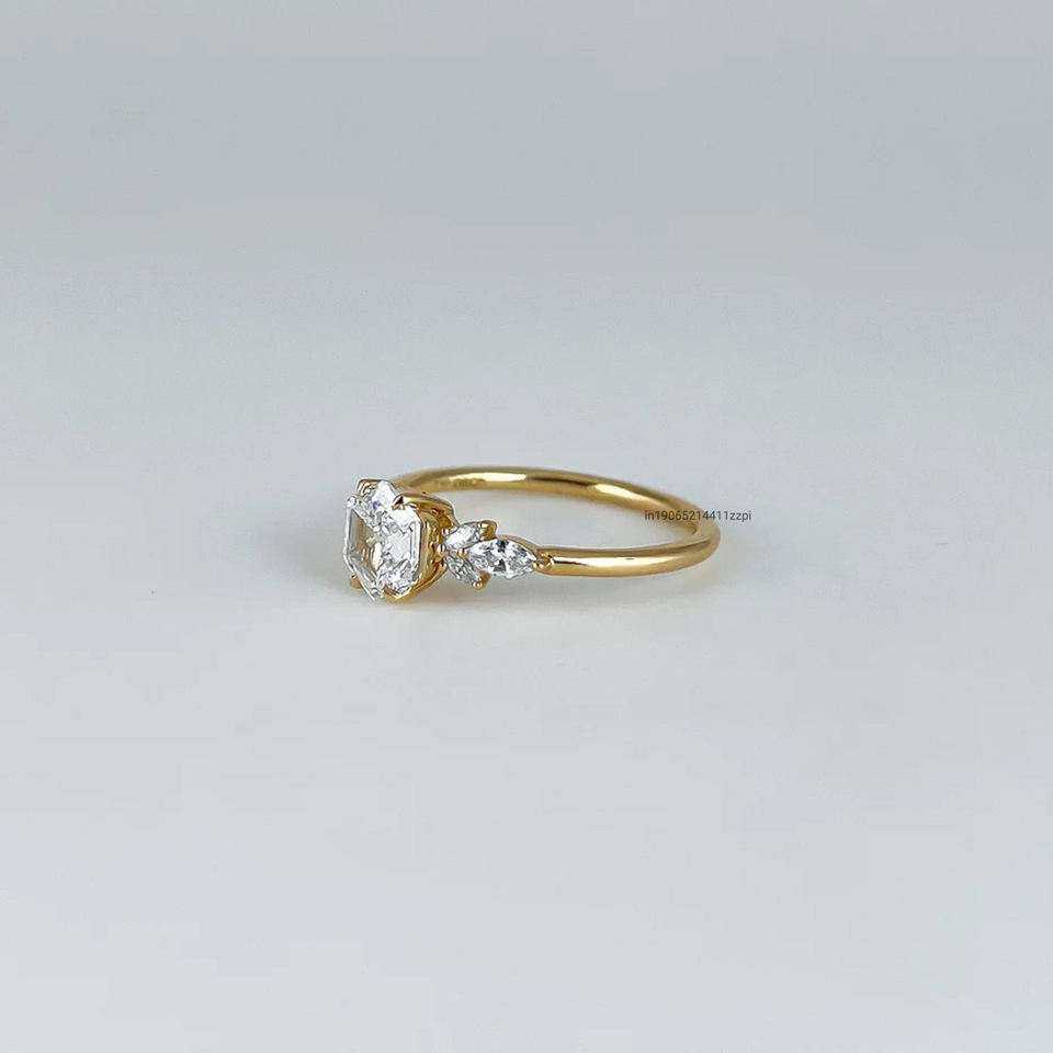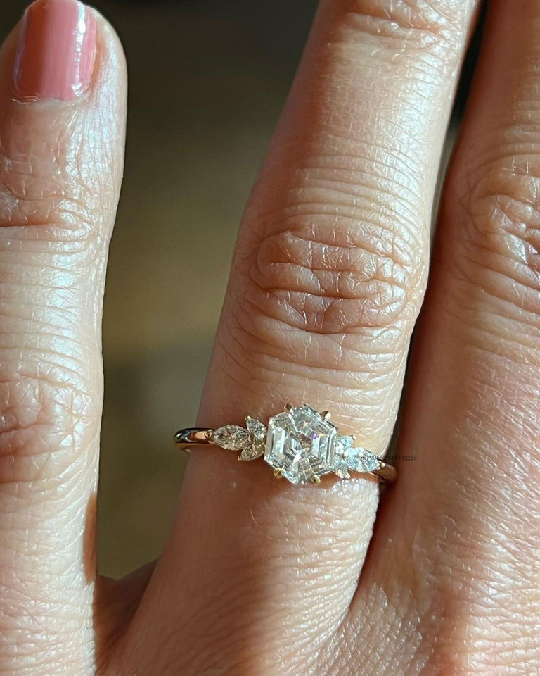 แหวนเพชรมอยส์ซอไนต์ทรงหกเหลี่ยมตัดด้วยหินศูนย์1.68กะรัตและมาร์คีส์เน้นสีทอง14K สีเหลือง