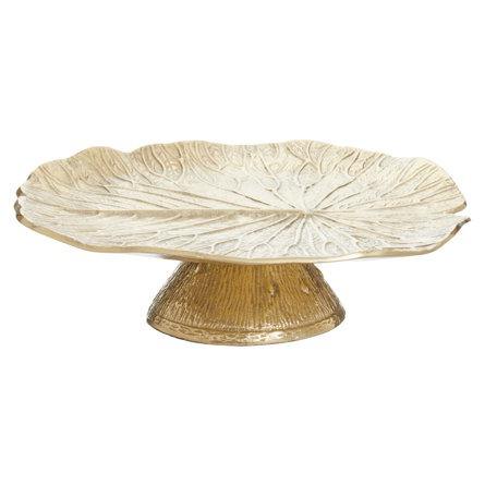 ที่ตั้งเค้กโลหะใบไม้สีทองแบบโบราณพร้อมรายละเอียดที่ซับซ้อนที่จัดแสดงขนมหวานหรูหราเหมาะสำหรับงานอีเวนต์ธีมวินเทจ