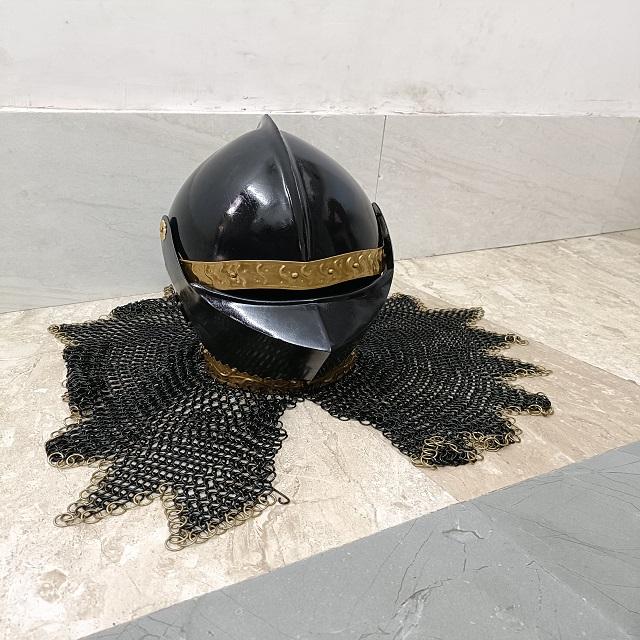 เกราะลูกโซ่ยุคกลางโบราณหมวกกันน็อคไวกิ้งขนาดเท่าเท่าของอัศวินโซ่ที่เก็บอาวุธเหล็กโลโก้ร้านหัตถกรรม