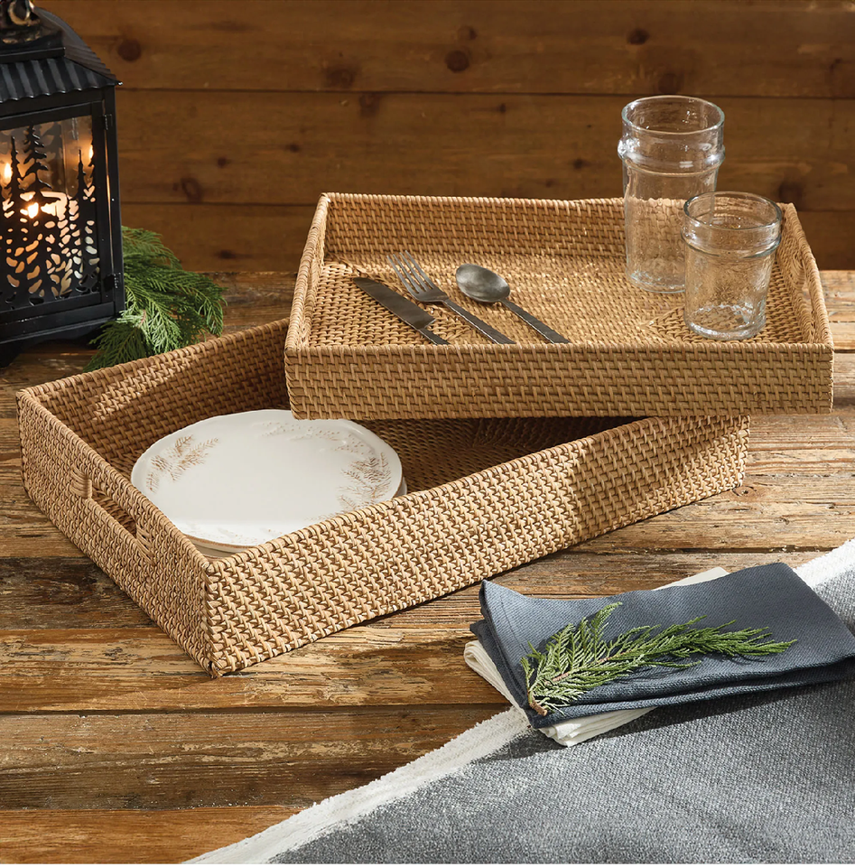ถาดสานทรงสี่เหลี่ยมผืนผ้าโบราณ พร้อมหูจับแบบเจาะรู ถาดสไตล์โบโฮสำหรับจัดเก็บและตกแต่ง ราคาถูกที่สุด