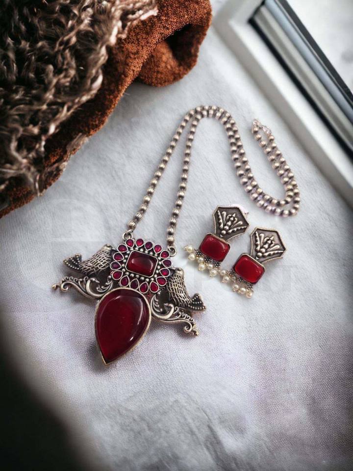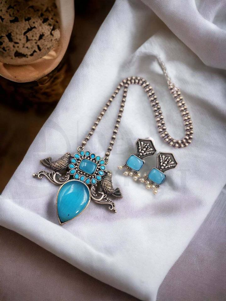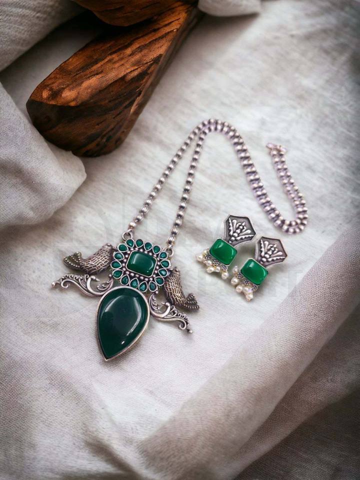 Antique Silver Brass Necklace Set Elegant Beautiful Design with Attractive Stone Work Featuring Pearl As Main Stone for Gift