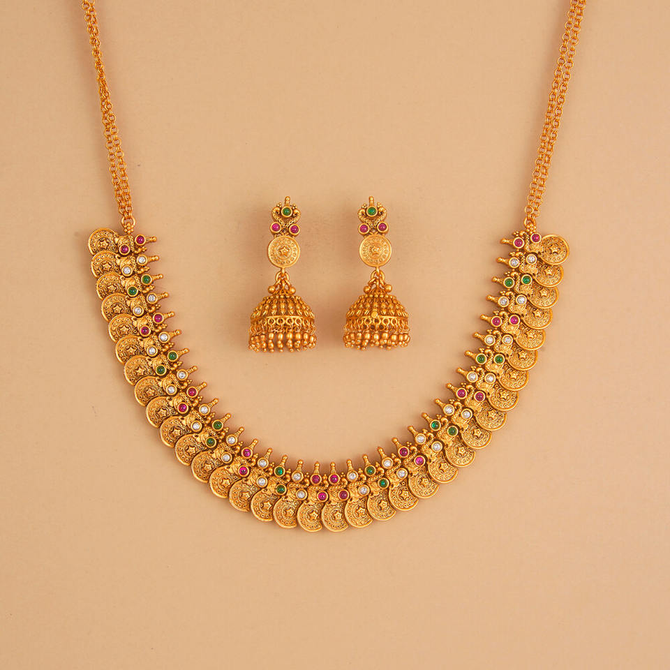 ชุดสร้อยคออินเดียใต้โบราณสีทองด้านสร้อยคอแฟชั่น