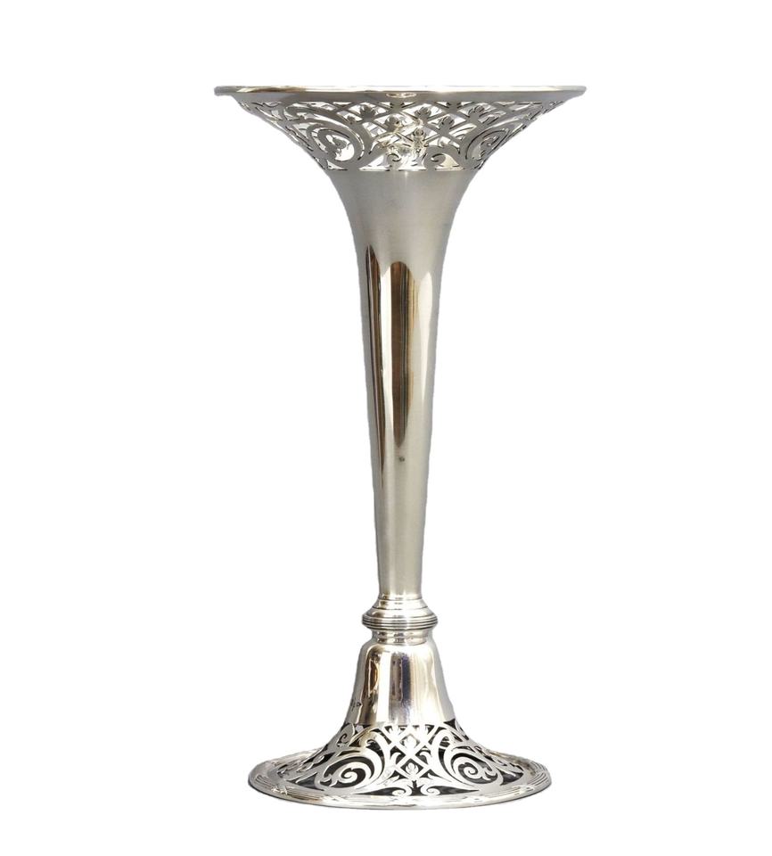 แจกันทรงแตรเงินสเตอร์ลิงโบราณ สไตล์เชฟฟิลด์ อาร์ต นูโว ขอบและฐานฉลุลาย แจกันดอกไม้ทรงสูง ดีไซน์หรูหรา ลดราคา