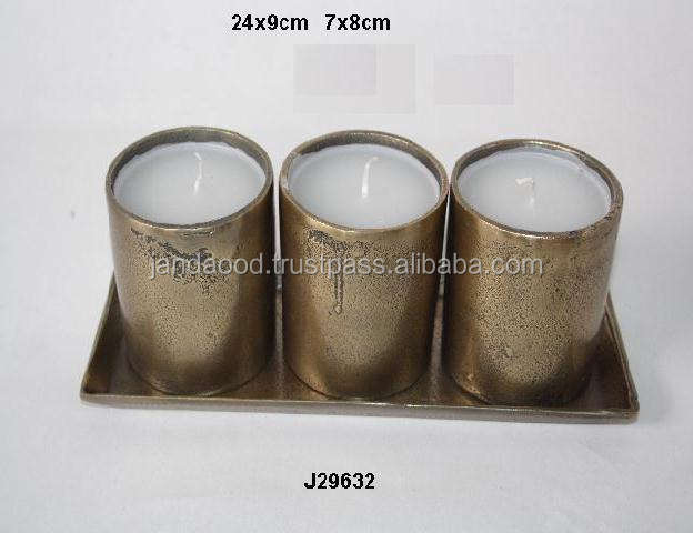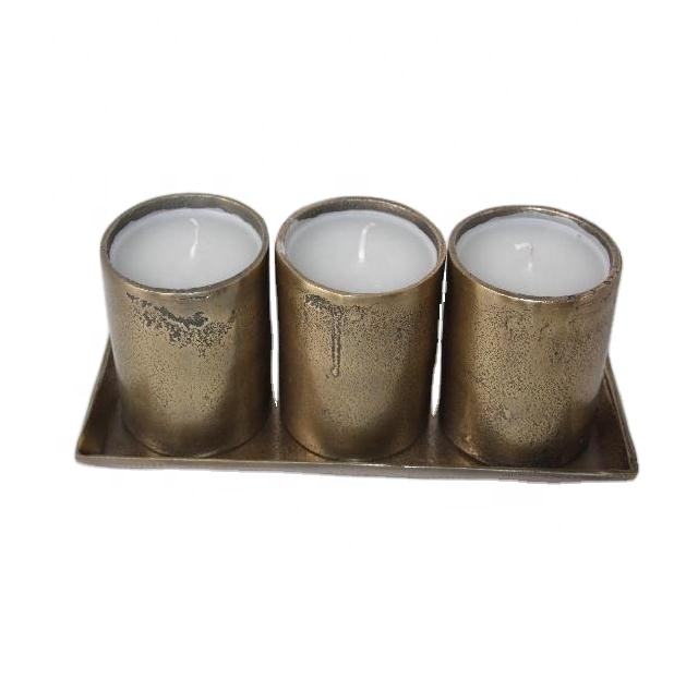 Antique-Style Three Votives Candle Holder with Round Crystal Tray Handmade Rough Brass Aluminium Metal Crafts Christmas Decor