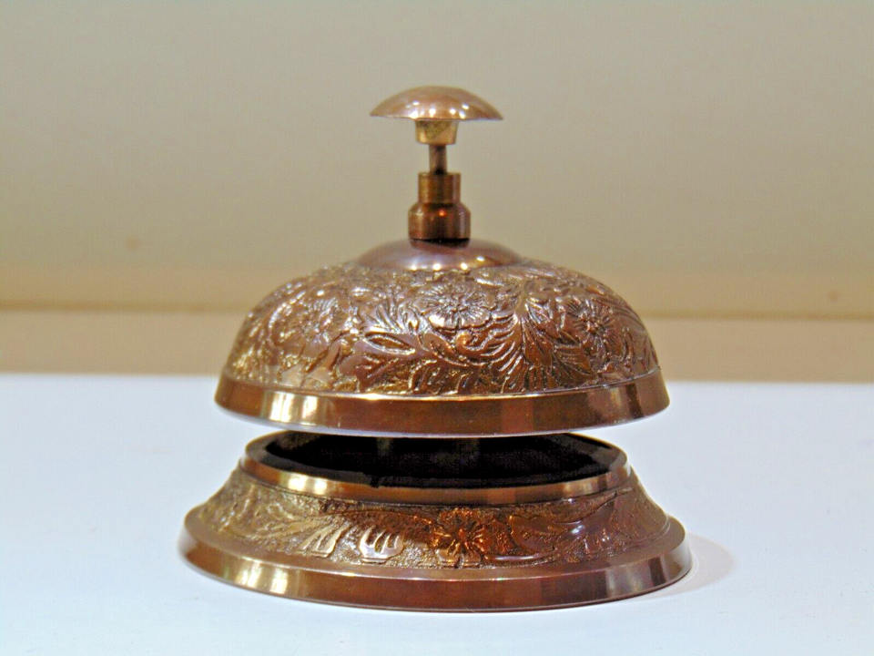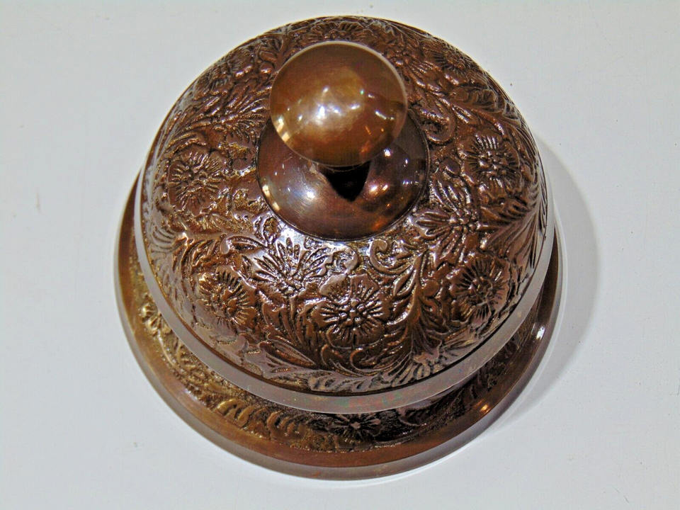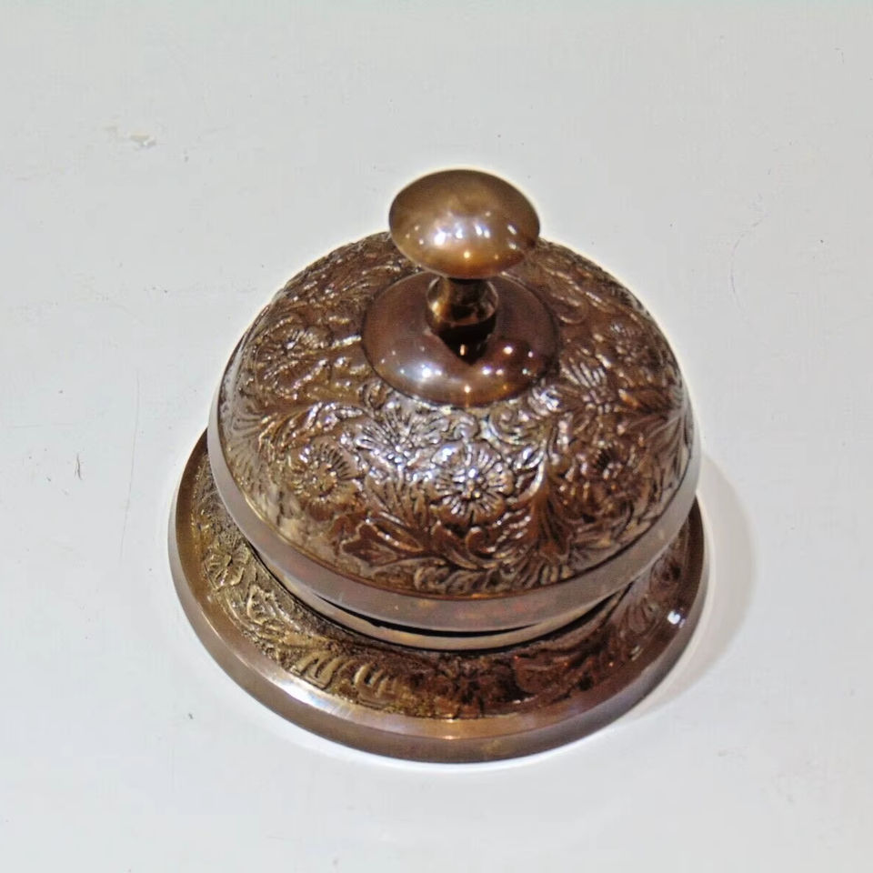 กระดิ่งโต๊ะทองเหลืองโบราณแบบวินเทจเคาน์เตอร์ต้อนรับที่หรูหราใหม่สำหรับบริการโรงแรมผลิตภัณฑ์งานฝีมือโลหะขัดแบบทันสมัย