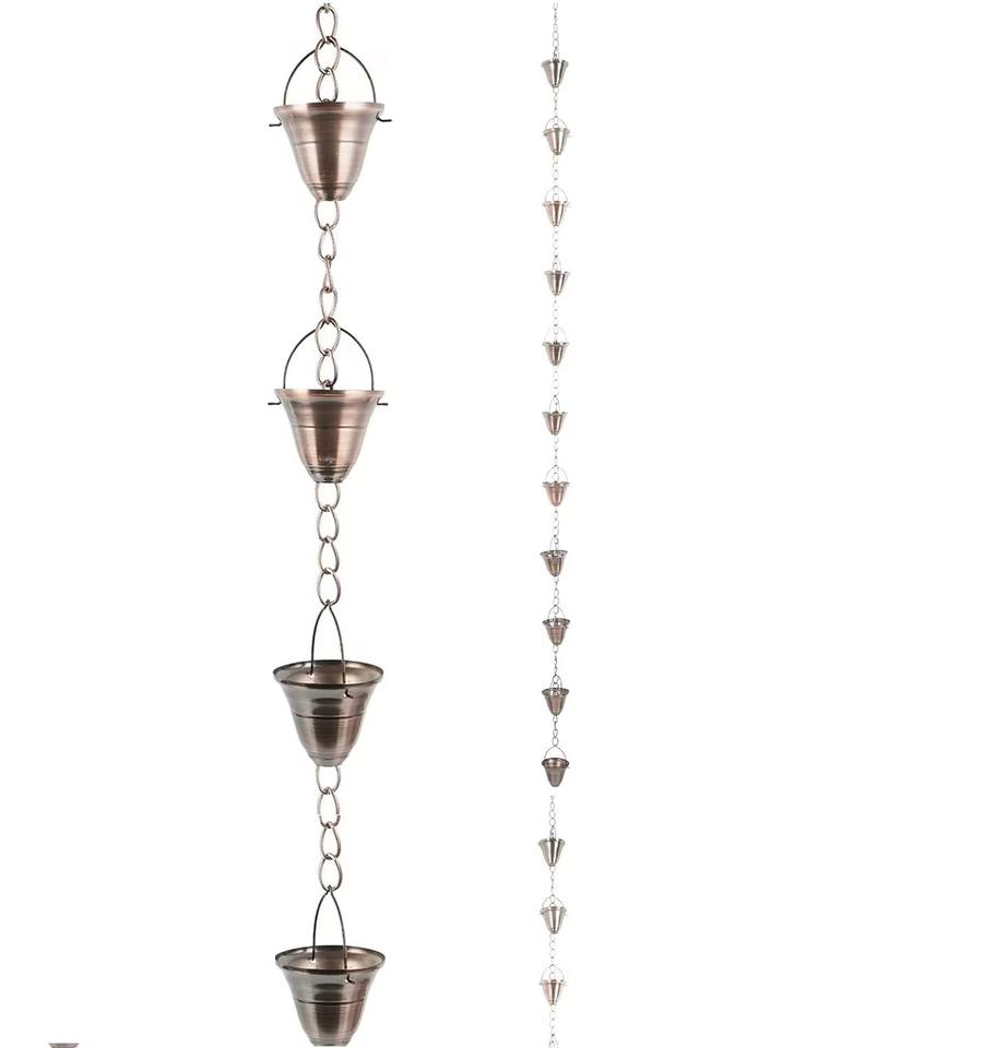โซ่รับน้ำฝนโลหะทองแดงโบราณ พร้อมเสน่ห์สถาปัตยกรรมเหนือกาลเวลา ผลิตด้วยมือและทนทานต่อสภาพอากาศ
