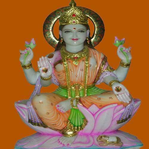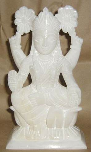 รูปปั้นพระลักษมีสีขาวลายหินอ่อนโบราณ ท่าทางนั่งพร้อมมืออวยพรบนดอกบัว สำหรับบ้านและวัด