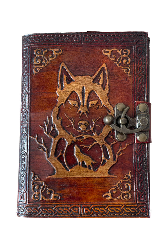 วารสารหนังลายนูนรูปหมาป่าโบราณพร้อมฝาปิดโลหะสมุดเยี่ยมสีเหลืองแฮนด์เมดกระดาษของขวัญสำหรับวันพ่อของเธอ