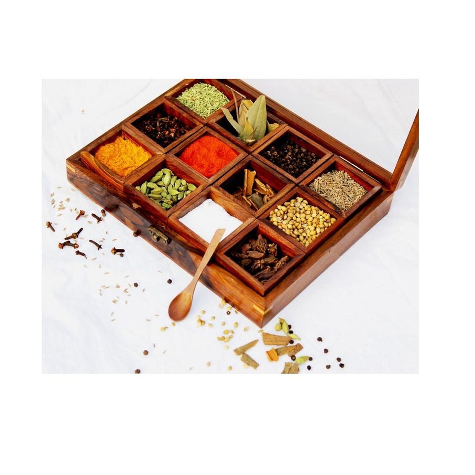 กล่องใส่เครื่องเทศมาซาลา,กล่องไม้/กล่องเครื่องเทศโบราณพร้อม9ส่วนช้อนสีน้ำตาลและห้องครัว