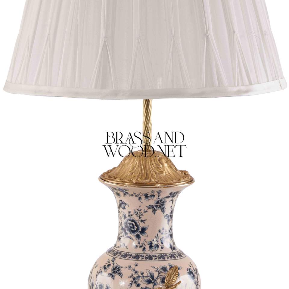 โคมไฟตั้งโต๊ะทองเหลืองโบราณพอร์ซเลนพร้อมลายดอกไม้สีฟ้าฐานหรูหราสีทองและเฉดผ้าไฟตกแต่งหรูหรา