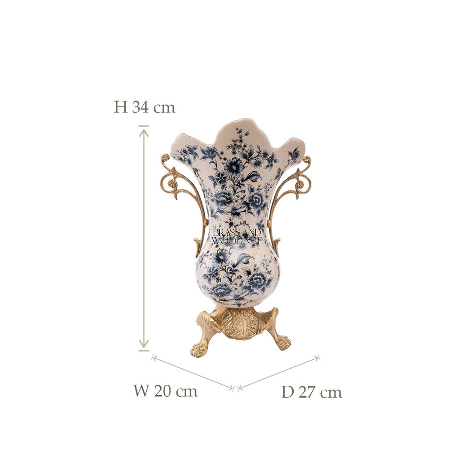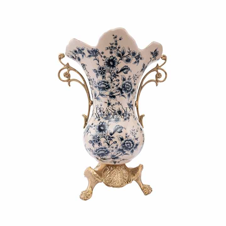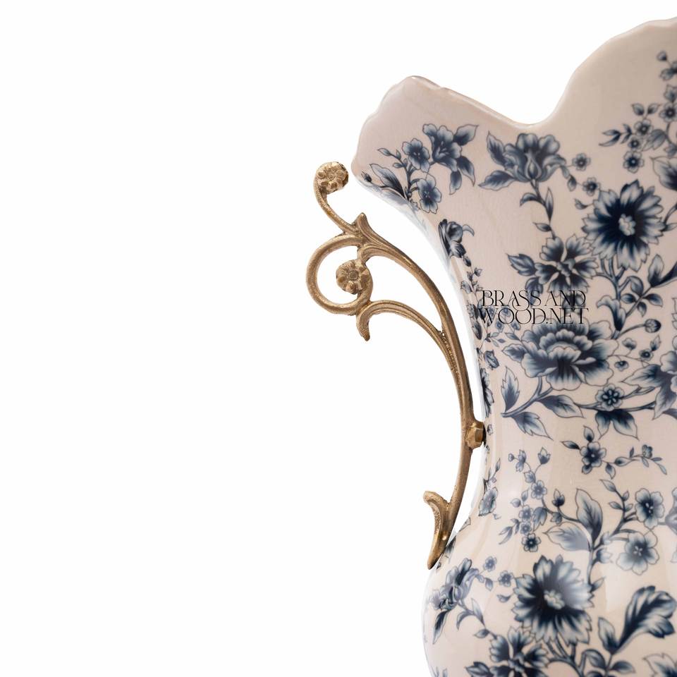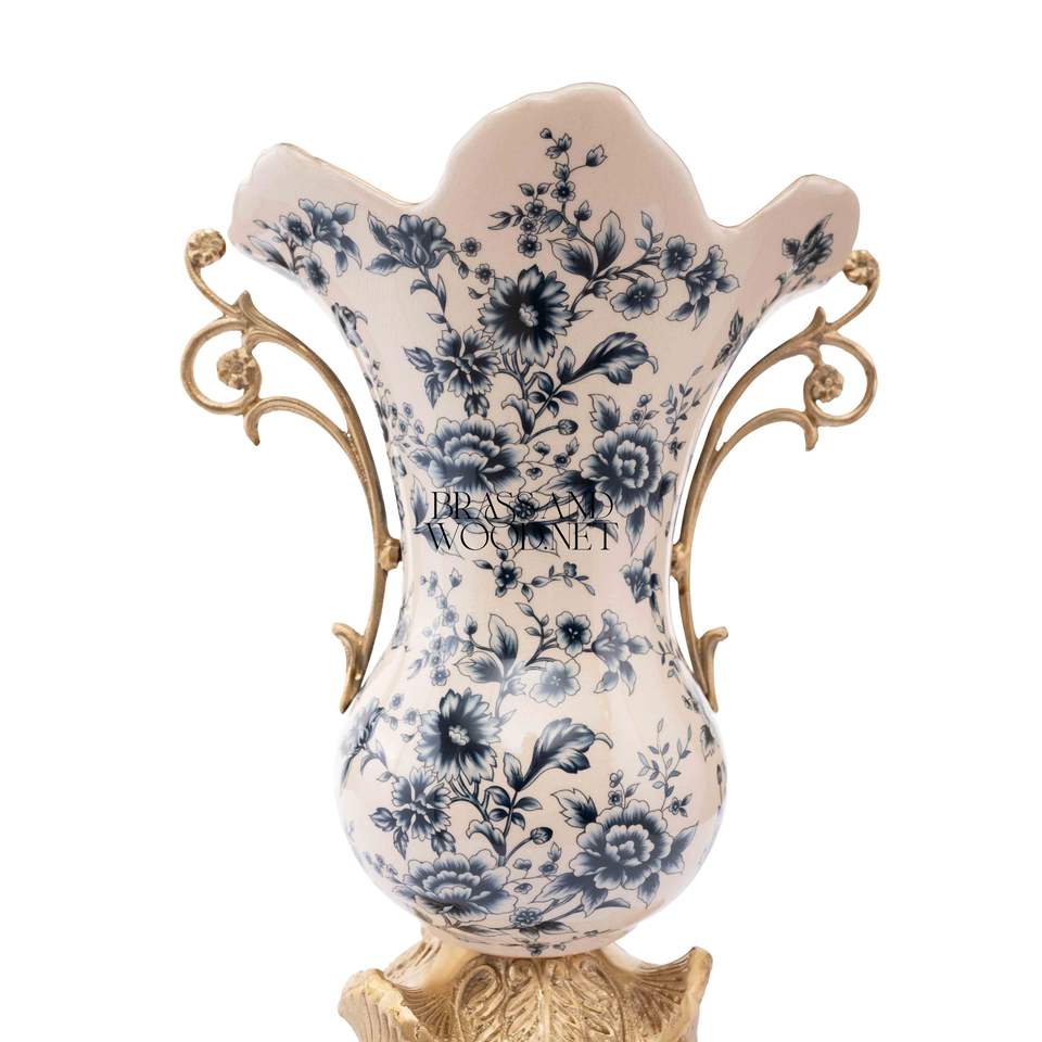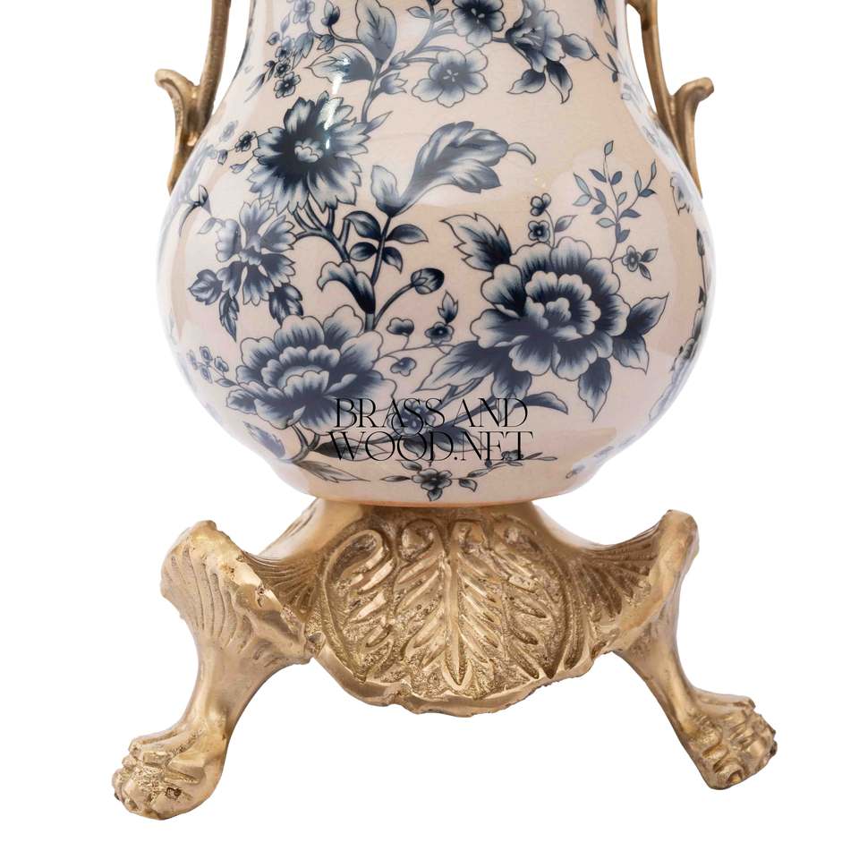 แจกันทองเหลืองโบราณพอร์ซเลนที่มีดีไซน์ดอกไม้สีฟ้าที่จับหรูหราและฐานของสะสมตกแต่งหรูหรา