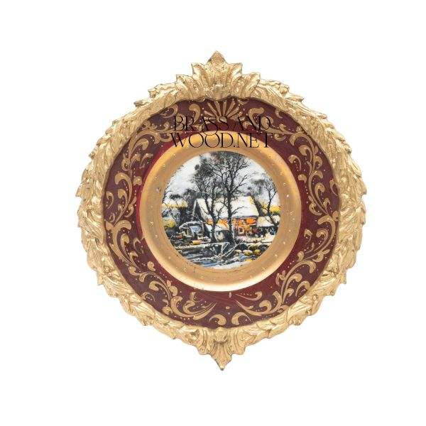 ศิลปะผนังทองเหลืองโบราณที่มีกรอบใบไม้หรูหราและภาพวาดพอร์ซเลนชนบทในดีไซน์วินเทจคลาสสิก