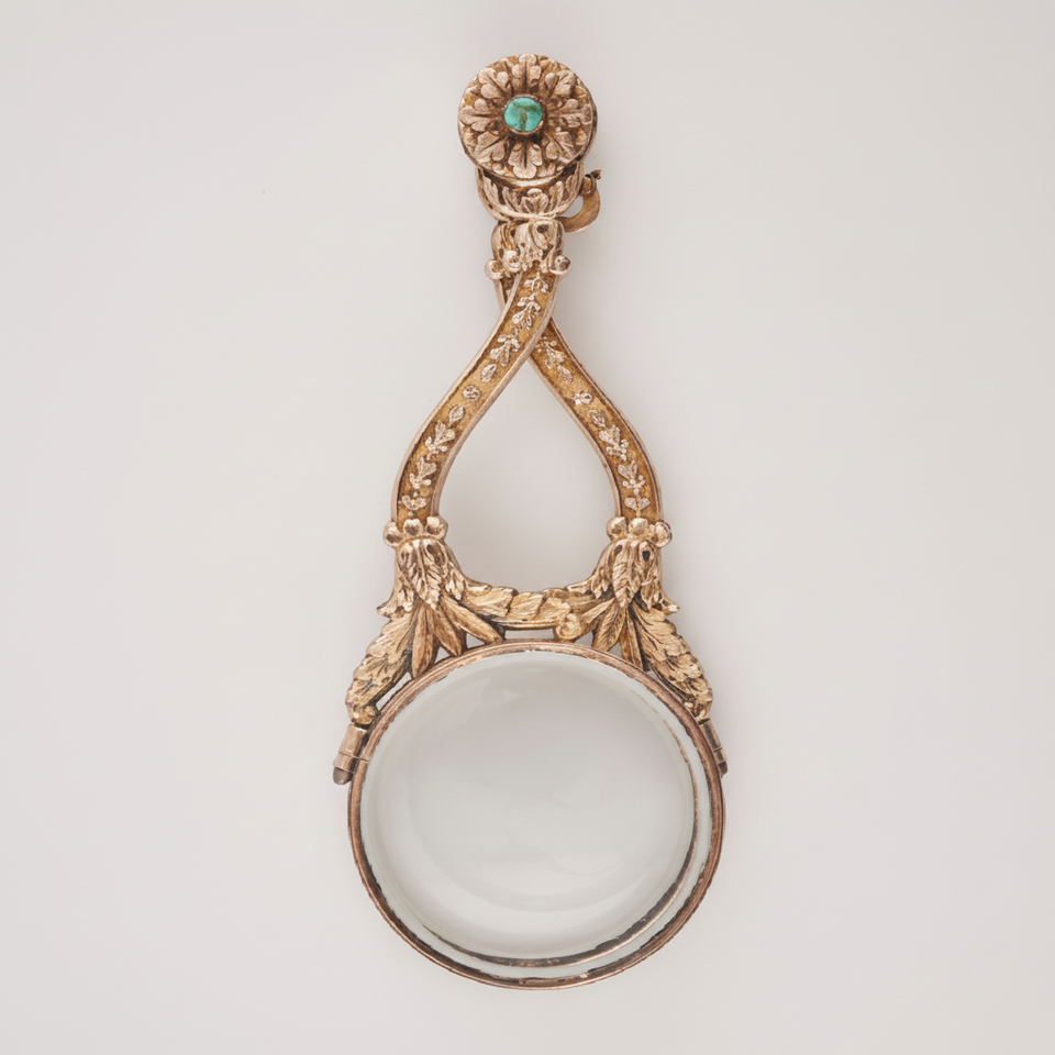 แว่นขยายสไตล์ลอร์เกตสีทองโบราณที่มีด้ามจับสลักลายใบไม้และรายละเอียดหินสีเขียวในราคาขายส่ง