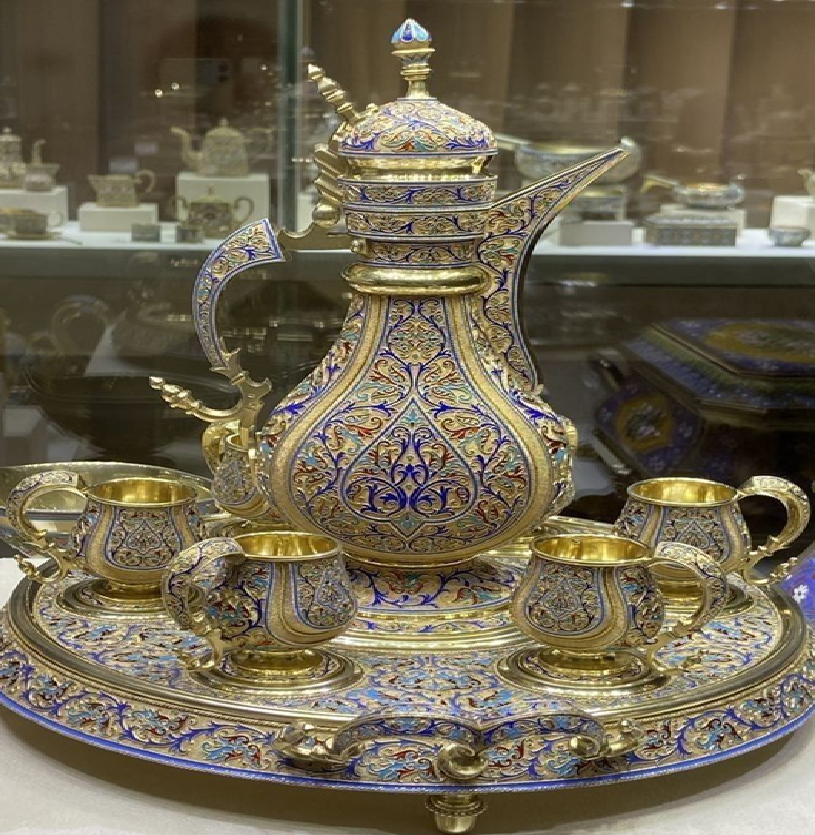 Antique-style multicolored enamel teapot set on a large decorative circular tray. Available at wholesale prices.