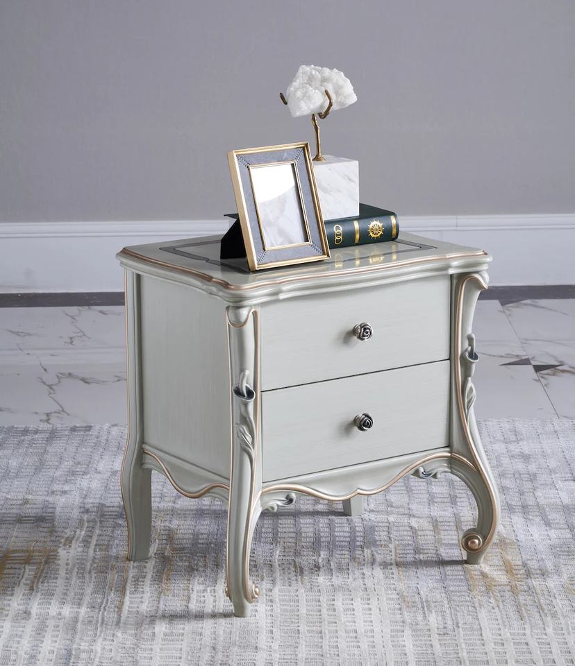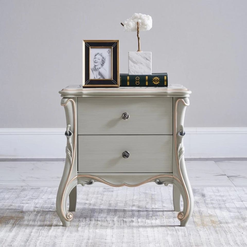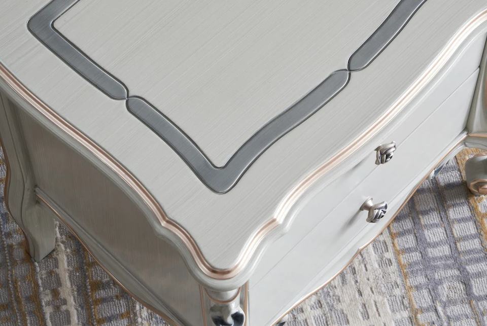 โต๊ะข้างเตียงแบบฝรั่งเศสของอองตัวต์ ทำจากไม้มะฮอกกานี ตกแต่งด้วยสีเทาอ่อน พร้อมลายทองและเงิน สำหรับเฟอร์นิเจอร์ห้องนอน