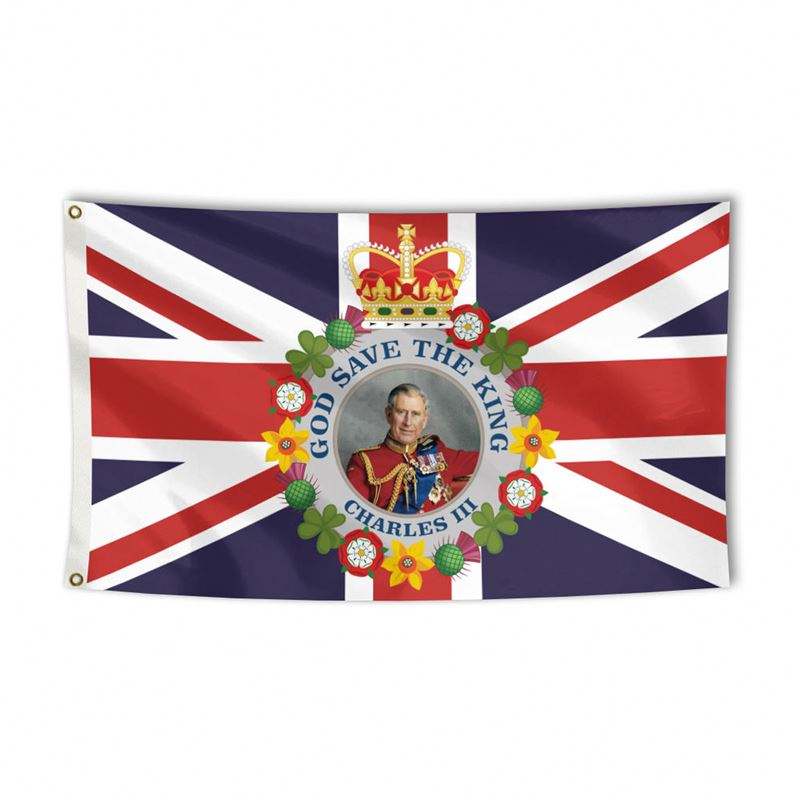 ธงโพลีเอสเตอร์พิมพ์ลายดิจิทัลสองด้านแบบกำหนดเอง รุ่นพิเศษสำหรับงานฉลองสมเด็จพระราชาธิบดีมหัศจรรย์พระเจ้าชาร์ลส์ที่ 3 แห่งสหราชอาณาจักร ปี 2023 ของ Aozhan