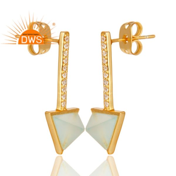 ต่างหูพลอยอควา ชาลเซโดนี ประดับเพชร CZ ชุบทองคำแท้ เงินแท้ 925 แบบยาว ต่างหูแบบติด คอลเลคชั่นคลาสสิก