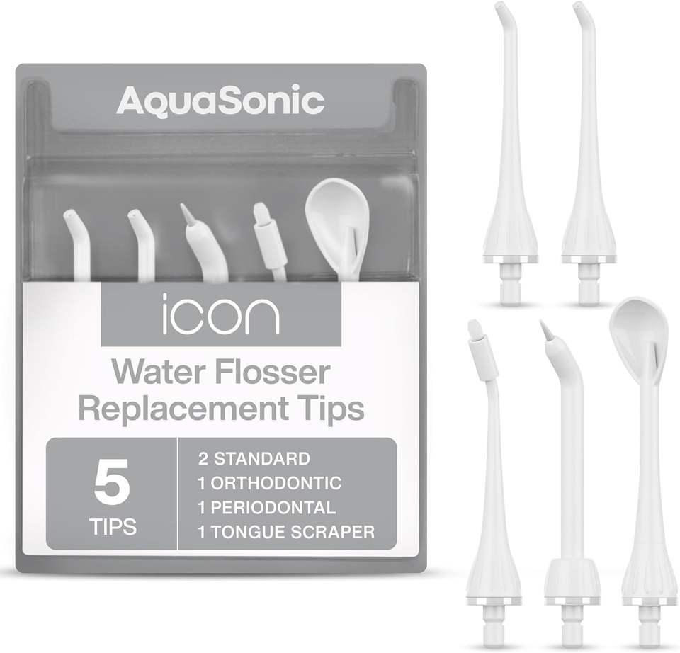 Aquasonic ICON Water flosser เคล็ดลับการเปลี่ยน-5เคล็ดลับ4ประเภท: มาตรฐาน, ปริทันต์, ทันตกรรมจัดฟันและที่ขูดลิ้น-ของแท้