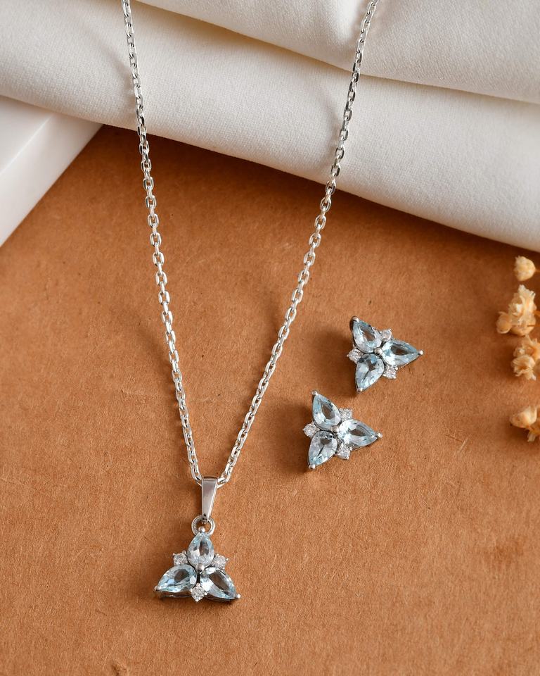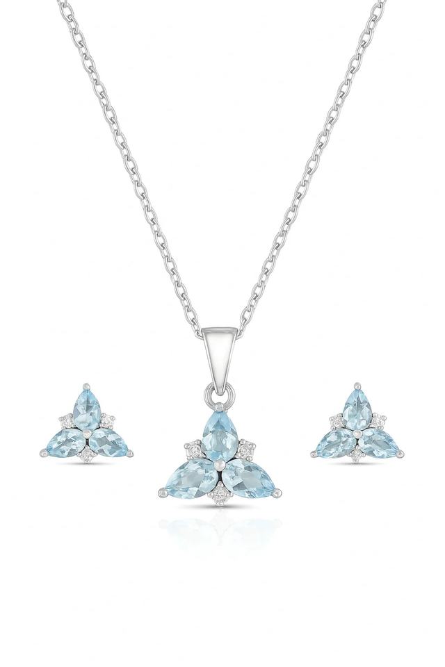 ชุดสร้อยคอและต่างหูเงินแท้ประดับทองคำลายดอกไม้ Aquaflora พร้อมพลอยสีฟ้าพาสเทลรูปทรงลูกแพร์ ดีไซน์ทันสมัย เหมาะเป็นของขวัญสำหรับการหมั้น