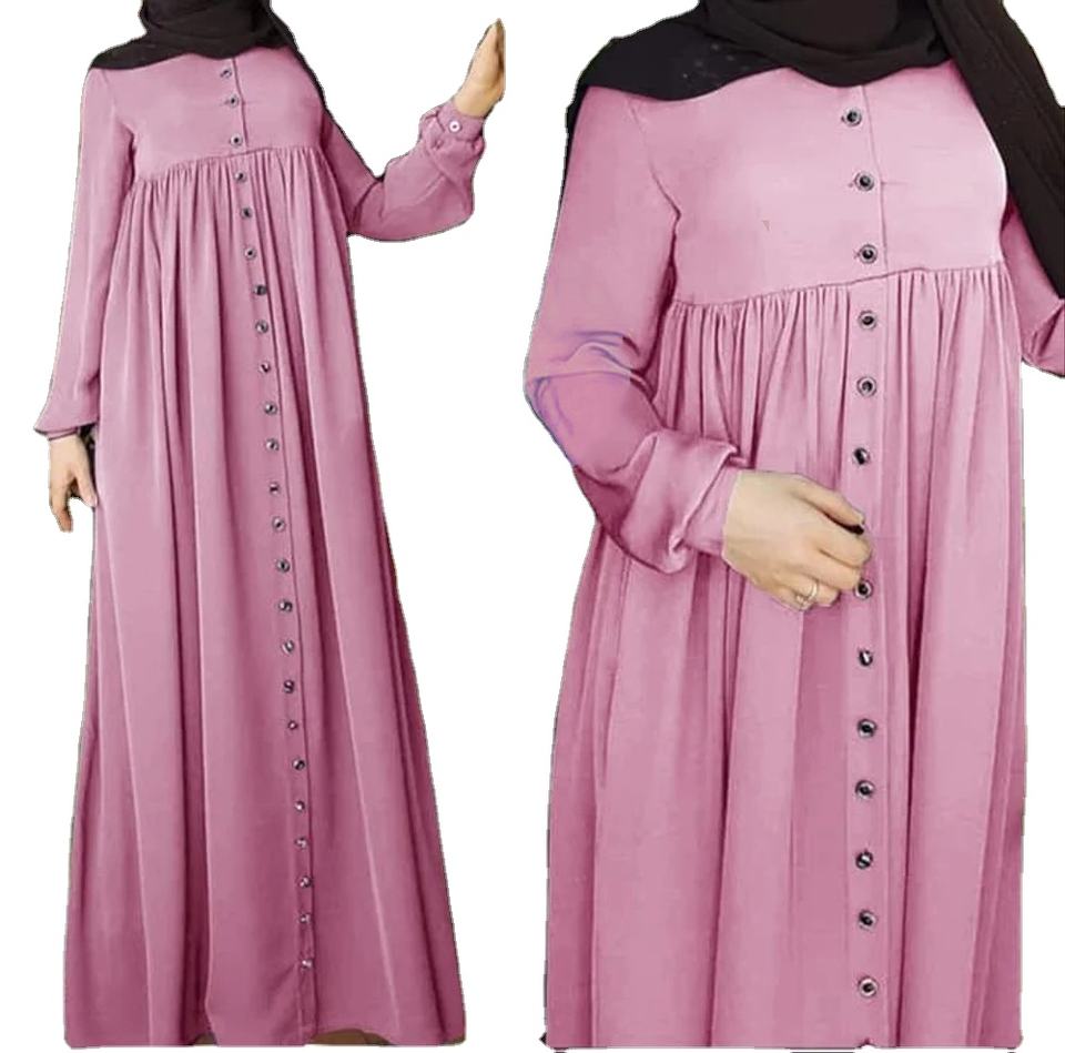 ชุดเดรสอาบายาของมุสลิมอาหรับชุดเดรสผ้าซาตินสีล้วนเอวสูงมีกระดุมแถวเดียว