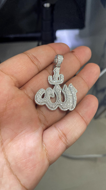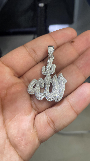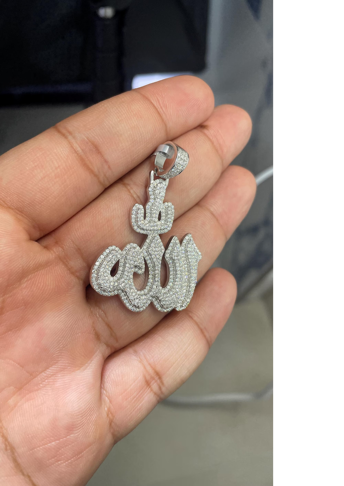 จี้รูปอัลลอฮ์แบบอาหรับ ชุบเงิน ประดับเพชรโมอิสซาไนต์เต็มตัว พร้อมลายอักษรวิจิตรแบบอิสลาม สไตล์ฮิปฮอป